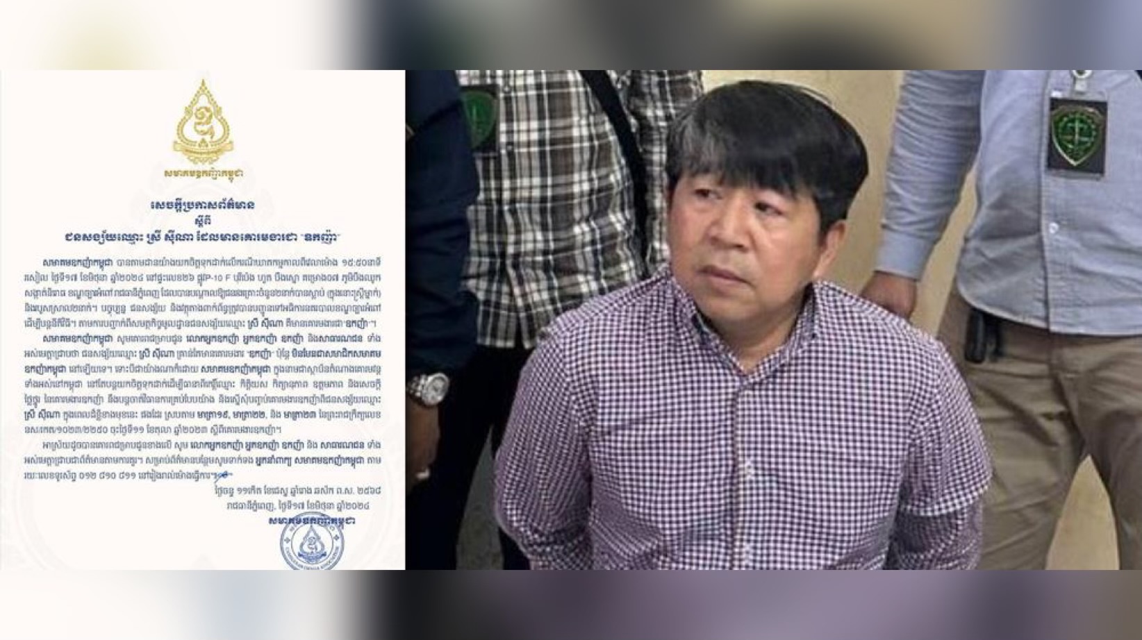 (ភ្នំពេញ)៖ សមាគមឧកញ៉ាកម្ពុជា បានតាមដានយ៉ាងយកចិត្តទុកដាក់លើករណីឃាតកម្មកាលពីវេលាម៉ោង ១៥:៥០នាទី រសៀលថ្ងៃទី១៧ ខែមិថុនា ឆ្នាំ២០២៤ នៅផ្ទះលេខ២៦ ផ្លូវP-10 F បុរីប៉េង ហួត បឹងស្នេ គម្រោង០៧ ភូមិបឹងឈូក សង្កាត់និរោធ ខណ្ឌច្បារអំពៅ រាជធានីភ្នំពេញ ដែលបានបណ្ដាលឱ្យជនរងគ្រោះចំនួន២នាក់បានស្លាប់ (ក្នុងនោះស្ត្រីម្នាក់) និងរបួសស្រាលចំនួន ២នាក់។ បច្ចុប្បន្ន ជនសង្ស័យ និងវត្ថុតាងពាក់ព័ន្ធត្រូវបានបញ្ជូនទៅអធិការនគរបាលខណ្ឌច្បារអំពៅ ដើម្បីបន្តនីតិវិធី។ តាមការបញ្ជាក់ពីសមត្ថកិច្ចមូលដ្ឋានជនសង្ស័យឈ្មោះ ស្រី ស៊ីណា គឺមានគោរមងារជា «ឧកញ៉ា»។ តាមរយៈសេចក្តីជូនដំណឹង សមាគមឧកញ៉ាកម្ពុជា បានគូសបញ្ជាក់ថា៖ «សូមគោរពជម្រាបជូន លោកអ្នកឧកញ៉ា អ្នកឧកញ៉ា