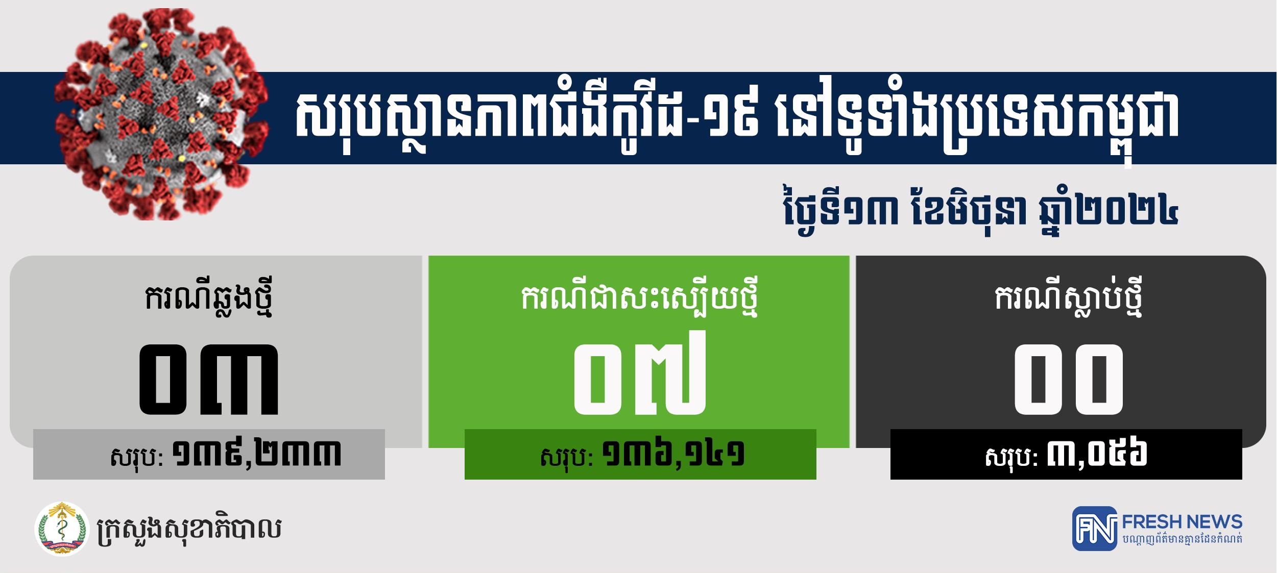 (ភ្នំពេញ)៖ ក្រសួងសុខាភិបាល នៅថ្ងៃទី១៣ ខែមិថុនា ឆ្នាំ២០២៤នេះ បានចេញសេចក្តីប្រកាសព័ត៌មាន បញ្ជាក់ពីការរកឃើញអ្នកឆ្លងកូវីដ១៩ចំនួន ៣នាក់ ខណៈជាអ្នកជាសះស្បើយ ៧នាក់។ សូមជម្រាបថា គិតត្រឹមការប្រកាសរបស់ក្រសួងសុខាភិបាល ថ្ងៃទី១៣ ខែមិថុនា ឆ្នាំ២០២៤ កម្ពុជារកឃើញអ្នកឆ្លងជំងឺកូវីដ១៩៖ សរុបចំនួន១៣៩,២៣៣នាក់, អ្នកជាសះស្បើយសរុបចំនួន ១៣៦,១៤១នាក់, ស្លាប់សរុបចំនួន ៣,០៥៦នាក់៕ ផ្តល់សិទ្ធិដោយ៖Fresh News