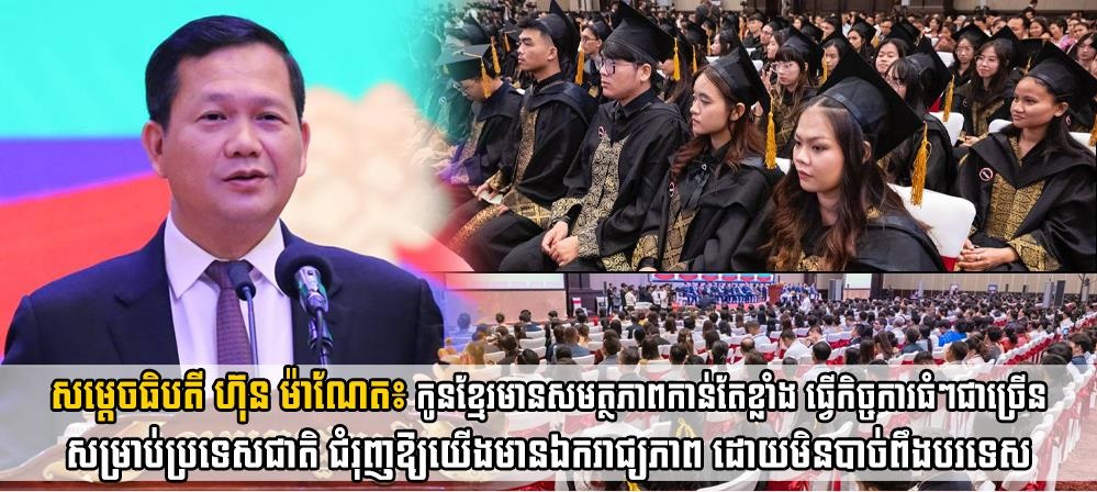 (ភ្នំពេញ)៖ សម្តេចធិបតី ហ៊ុន ម៉ាណែត នាយករដ្ឋមន្ត្រីនៃកម្ពុជា នៅព្រឹកថ្ងៃទី១៣ ខែមិថុនា ឆ្នាំ២០២៤នេះបានថ្លែងឱ្យដឹងថា ឥឡូវនេះ កូនខ្មែរមានសមត្ថភាពកាន់តែខ្លាំង ក្នុងការធ្វើកិច្ចការធំៗជាច្រើនសម្រាប់ប្រទេសជាតិ ដោយមិនពឹងបរទេសនោះទេ ដែលនេះជាមោទនភាពសម្រាប់ខ្មែរ ហើយត្រូវតែជំរុញលើកទឹកចិត្តគាំទ្រកូនខ្មែរ ដើម្បីសង្គមជាតិមានរីកចម្រើនទៅមុខទៀត។ សម្តេចនាយករដ្ឋមន្ត្រី បានលើកឡើងពីសមិទ្ធផលជាច្រើន ដែលកូនខ្មែរធ្វើបានសម្រាប់ប្រទេសជាតិ ដូចជាការបង្កើតប្រព័ន្ធបច្ចេកវិទ្យាព័ត៌មានវិទ្យា (ថ្នាលផ្ទៀងផ្ទាត់ឯកសារផ្លូវការ របស់រាជរដ្ឋាភិបាល verify.gov.kh) ដែលឈ្នះពានរង្វាន់លេខ១ នៅអាស៊ាន និងលេខ២ លើកពិភពលោក ព្រមទាំងការកសាងនូវហេដ្ឋាចរនាសម្ព័ន្ធជាច្រើនទៀត ដូចជា អគារវិមានសន្តិភាព ដែលគូរប្លង់ដោយកូនខ្មែរ វិស្វករខ្មែរ សាងសង់ដោយក្រុមហ៊ុនខ្មែរ។ សម្តេចបានលើកឡើងទៀតថា កាលពីឆ្នាំ១៩៩០ជាង ការធ្វើផែនការមួយចំនួន