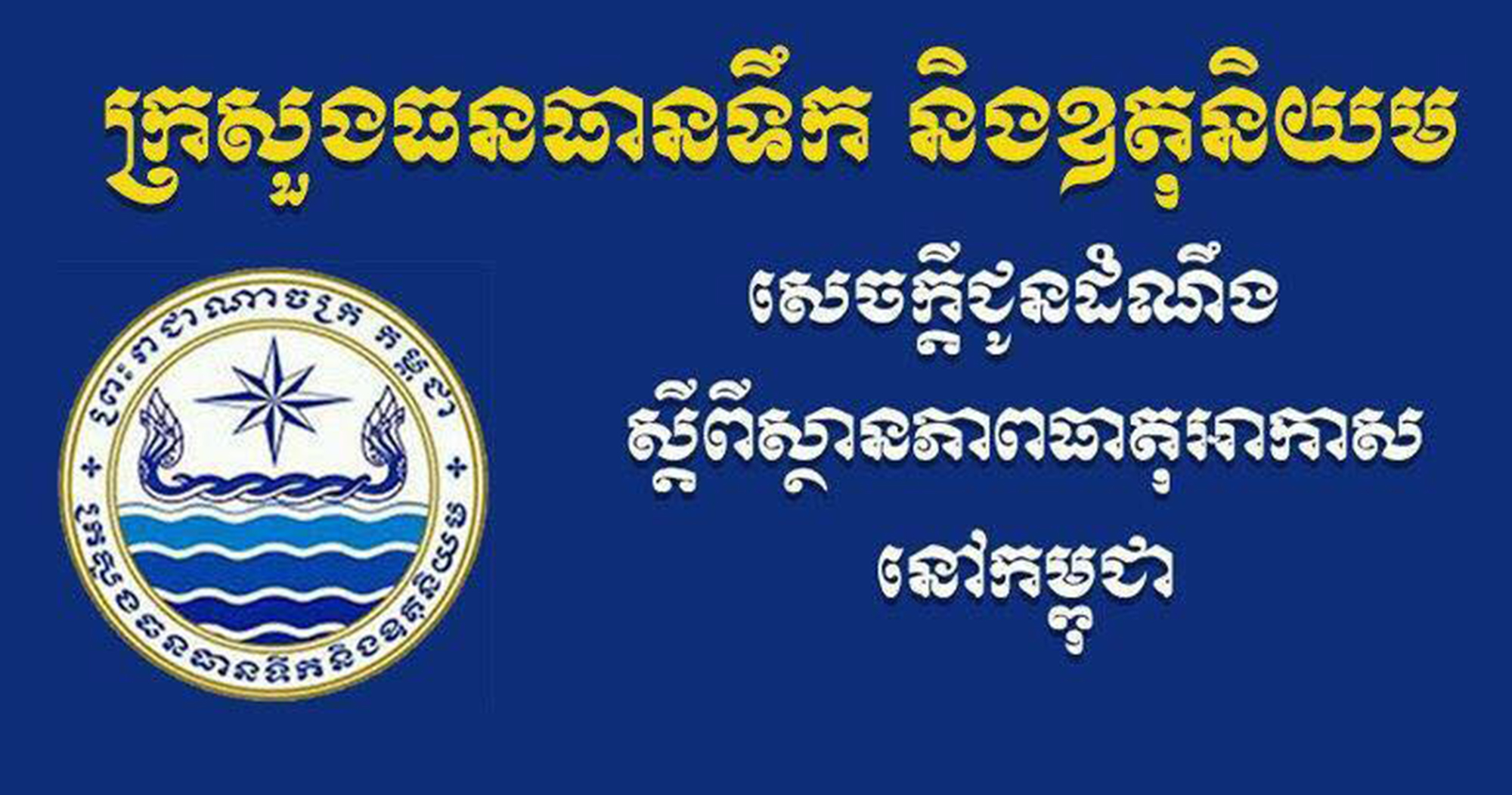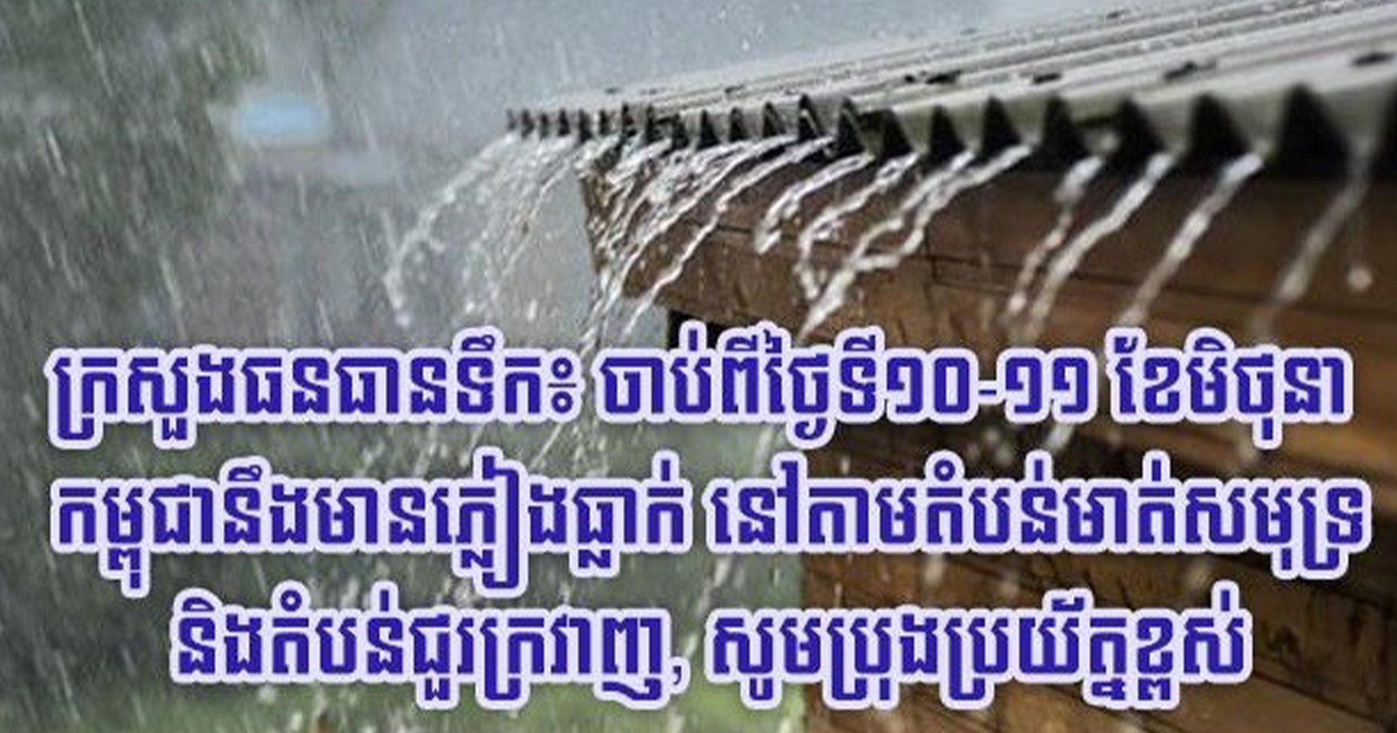 (ភ្នំពេញ)៖ ក្រសួងធនធានទឹក និងឧតុនិយម បានបញ្ជាក់ឲ្យដឹងថា ចាប់ពីថ្ងៃទី១០ ដល់ថ្ងៃទី១១ ខែមិថុនា ឆ្នាំ២០២៤ កម្ពុជានឹងមានភ្លៀងធ្លាក់ និងបន្តធ្លាក់ នៅតាមតំបន់មាត់សមុទ្រ និងតំបន់ជួរក្រវាញ។ នេះបើតាមសេចក្ដីជូនដំណឹង ដែលបណ្ដាញព័ត៌មាន Fresh News ទទួលបាននៅថ្ងៃទី១០ ខែមិថុនា ឆ្នាំ២០២៤។ សេចក្ដីជូនដំណឹងបានឲ្យដឹងថា យោងតាមស្ថានភាពវិវត្ត នៃសីតុណ្ហភាពនៅលើផ្ទៃមហាសមុទ្រប៉ាស៊ីហ្វិក និងមហាសមុទ្រឥណ្ឌាភាគខាងកើត និងតំបន់អេក្វាទ័រ ក្រសួងធនធានទឹក និងឧតុនិយម សូមជម្រាបជូនដល់សាធារណជនឲ្យបានជ្រាបថា៖ កម្ពុជាចាប់ពីថ្ងៃទី១០ ដល់ថ្ងៃទី១១ ខែមិថុនា ឆ្នាំ២០២៤ នៅតាមតំបន់មាត់សមុទ្រ ដូចជា ខេត្តកោះកុង ខេត្តព្រះសីហនុ