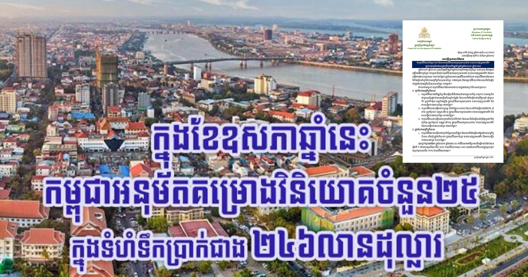 (ភ្នំពេញ)៖ គម្រោងវិនិយោគចំនួន២៥ ដែលមានទុនវិនិយោគសរុបប្រមាណជាង២៤៦លានដុល្លារអាម៉េរិក ត្រូវបានអនុម័តដោយក្រុមប្រឹក្សាអភិវឌ្ឍន៍កម្ពុជា ក្នុងខែឧសភា ឆ្នាំ២០២៤។ នេះបើតាមសេចក្ដីប្រកាសព័ត៌មាន របស់ក្រុមប្រឹក្សាអភិវឌ្ឍន៍កម្ពុជា ដែលបណ្ដាញព័ត៌មាន Fresh News ទទួលបាននៅថ្ងៃទី១០ ខែមិថុនា ឆ្នាំ២០២៤។ ក្រុមប្រឹក្សាអភិវឌ្ឍន៍កម្ពុជា បានឲ្យដឹងថា ក្នុងខែឧសភា ឆ្នាំ២០២៤ ក្រុមប្រឹក្សាអភិវឌ្ឍន៍កម្ពុជាបានអនុម័តគម្រោងថ្មីចំនួន ២៤គម្រោង និងគម្រោងពង្រីកផលិតកម្មចំនួន ១គម្រោង ដែលមានទុនវិនិយោគសរុបប្រមាណជាង ២៤៦លានដុល្លារអាម៉េរិក និងអាចបង្កើតការងារបានប្រមាណ ១៥ពាន់កន្លែង។ ក្នុងចំណោមគម្រោងវិនិយោគទាំង២៥ គម្រោងវិនិយោគដែលមាន ទីតាំងស្ថិតនៅក្រៅតំបន់សេដ្ឋកិច្ចពិសេសមានចំនួន ១៧គម្រោង និងគម្រោងវិនិយោគដែលមានទីតាំងស្ថិតនៅក្នុងតំបន់សេដ្ឋកិច្ចពិសេសមានចំនួន ៨គម្រោង។ បើតាមក្រុមប្រឹក្សាអភិវឌ្ឍន៍កម្ពុជា, ជាការកត់សម្គាល់ គម្រោងវិនិយោគដែលមានភាពលេចធ្លោជាងគេប្រចាំខែឧសភារួមមាន៖