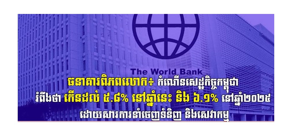 (ភ្នំពេញ)៖ សកម្មភាពសេដ្ឋកិច្ចកម្ពុជា បានកើនឡើងនៅក្នុងត្រីមាសទី១ ឆ្នាំ២០២៤ ដោយសារតែការងើបឡើងវិញនៃវិស័យសេវាកម្ម និងការនាំចេញទំនិញ ទោះបីជាតម្រូវការក្នុងស្រុកបានធ្លាក់ចុះក៏ដោយ។ នេះបើយោងតាមរបាយការណ៍ បច្ចុប្បន្នភាពសេដ្ឋកិច្ចកម្ពុជា របស់ធនាគារពិភពលោក ដែលបណ្ដាញព័ត៌មាន Fresh News ទទួលបាននៅថ្ងៃទី០៦ ខែមិថុនា ឆ្នាំ២០២៤។ បើតាមរបាយការណ៍, កំណើនសេដ្ឋកិច្ច ត្រូវបានគេរំពឹងថា នឹងប្រសើរឡើងបន្តិច ពីកម្រិត ៥.៦% ក្នុងឆ្នាំ២០២៣ ទៅ៥.៨% នៅឆ្នាំ២០២៤ ហើយនឹងអាចប្រសើរឡើងបន្ថែមទៀត នៅកម្រិត៦.១% នៅឆ្នាំ២០២៥ និង៦.៤% នៅឆ្នាំ២០២៦ ដោយសារការប្រសើរឡើងវិញ លើការនាំចេញវិស័យកាត់ដេរ ទំនិញធ្វើដំណើរ និងស្បែកជើង រួមទាំងការងើបឡើងវិញ