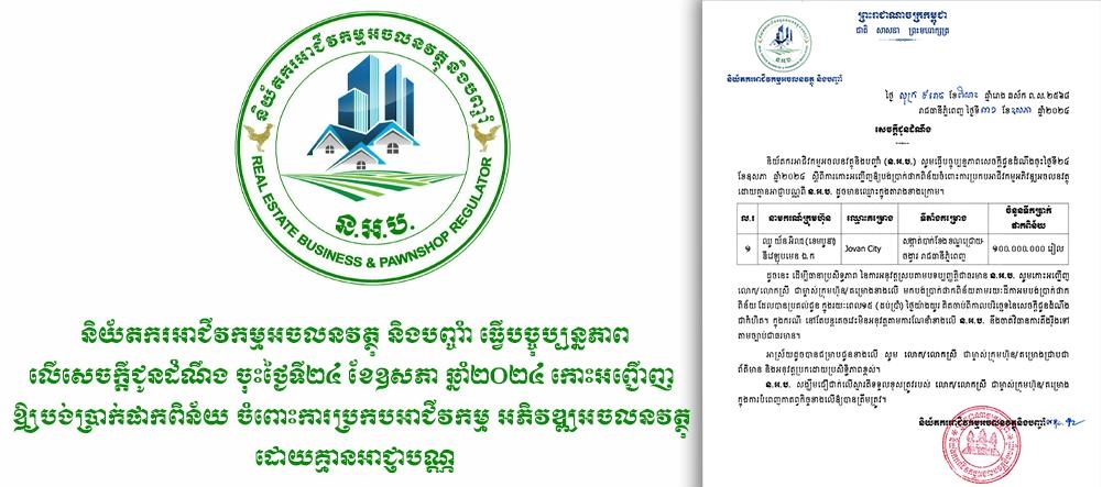 (ភ្នំពេញ)៖ និយ័តករអាជីវកម្មអចលនវត្ថុ និងបញ្ចាំ (ន.អ.ប.) បានធ្វើបច្ចុប្បន្នភាពលើសេចក្តីជូនដំណឹង ចុះថ្ងៃទី២៤ ខែឧសភា ឆ្នាំ២០២៤ ស្តីពី ការកោះអញ្ជើញឲ្យបង់ប្រាក់ផាកពិន័យ ចំពោះការប្រកបអាជីវកម្ម អភិវឌ្ឍអចលនវត្ថុ ដោយគ្មានអាជ្ញាបណ្ណពី ន.អ.ប.។ នេះបើតាមសេចក្ដីជូនដំណឹង ដែលបណ្ដាញព័ត៌មាន Fresh News ទទួលបាននៅថ្ងៃទី៣១ ខែឧសភា ឆ្នាំ២០២៤៕ផ្តល់សិទ្ធិដោយ៖ Fresh News ខាងក្រោមនេះ ជាសេចក្ដីជូនដំណឹង របស់និយ័តករអាជីវកម្មអចលនវត្ថុ និងបញ្ចាំ៖