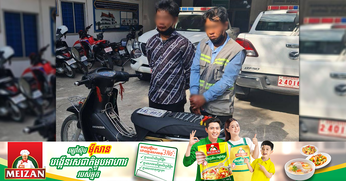 (ភ្នំពេញ)៖ ដោយអនុវត្តតាមបទបញ្ជារបស់លោកឧត្តមសេនីឯក ជួន ណារិន្ទ អគ្គស្នងការរង និងជាស្នងការនគរបាលរាជធានីភ្នំពេញ នៅថ្ងៃទី០៥ ខែធ្នូ ឆ្នាំ២០២៣នេះ កម្លាំងអធិការដ្ឋាននគរបាលខណ្ឌទួលគោក បានស្រាវជ្រាវ និងឈានដល់ការចាប់ខ្លួនជនសង្ស័យ២នាក់ ក្រោយធ្វើសកម្មភាពលួចម៉ូតូមួយគ្រឿង កាលពីសប្ដាហ៍កន្លងទៅ នៅត្រង់ចំណុចបុរីវិមានភ្នំពេញ ផ្លូវលេខ៧៧៧ ក្រុមទី៨ ភូមិខ១ សង្កាត់ច្រាំងចំរេះទី២ ខណ្ឌឫស្សីកែវ។ របាយការណ៍របស់ស្នងការដ្ឋាននគរបាលរាជធានីភ្នំពេញ បានឲ្យដឹងថា ជនរងគ្រោះឈ្មោះ អេង ហ៊ាង អាយុ៣៥ឆ្នាំ មុខរបរកម្មករសំណង់ មានទីលំនៅភូមិព្រៃខ្លា ឃុំប្រឡាយ ស្រុកស្ទោង ខេត្តកំពង់ធំ។ ដោយឡែក ជនសង្ស័យទាំង២នាក់ឈ្មោះ ឃុប