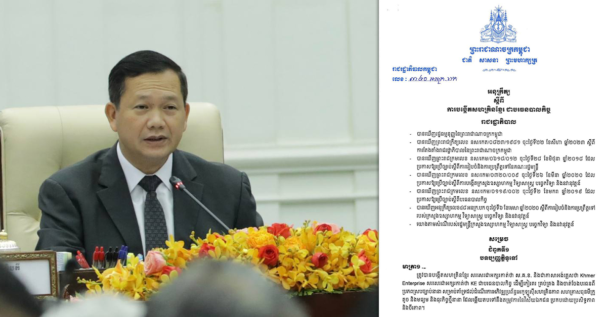 (ភ្នំពេញ)៖ សម្ដេចមហាបវរធិបតីហ៊ុន ម៉ាណែត នាយករដ្ឋមន្ដ្រីនៃកម្ពុជា បានចេញអនុក្រឹត្យ ស្ដីពី ការបង្កើតសហគ្រិនខ្មែរ (Khmer Enterprise) ជាបរធនបាលកិច្ច។ នេះបើតាមអនុក្រឹត្យ ដែលបណ្ដាញព័ត៌មាន Fresh News ទទួលបាននៅថ្ងៃទី៣១ ខែតុលា ឆ្នាំ២០២៣។ អនុក្រឹត្យបានបញ្ជាក់ថា ការបង្កើតឱ្យ សហគ្រិនខ្មែរ (Khmer Enterprise) ជាបរធនបាលកិច្ច ដើម្បីកៀរគរ គ្រប់គ្រង និងចាត់ចែងបរធនពីប្រភពស្របច្បាប់នានា សម្រាប់គាំទ្រដល់ដំណើរការអភិវឌ្ឍប្រព័ន្ធអេកូឡូស៊ីសហគ្រិនភាព សហគ្រាសធុនមីក្រូតូច និងមធ្យម និងធុរកិច្ចថ្មីនានា ដែលឆ្លើយតបទៅនឹងតម្រូវការ នៃវិស័យឯកជន ប្រកបដោយប្រសិទ្ធភាព និងចីរភាព៕