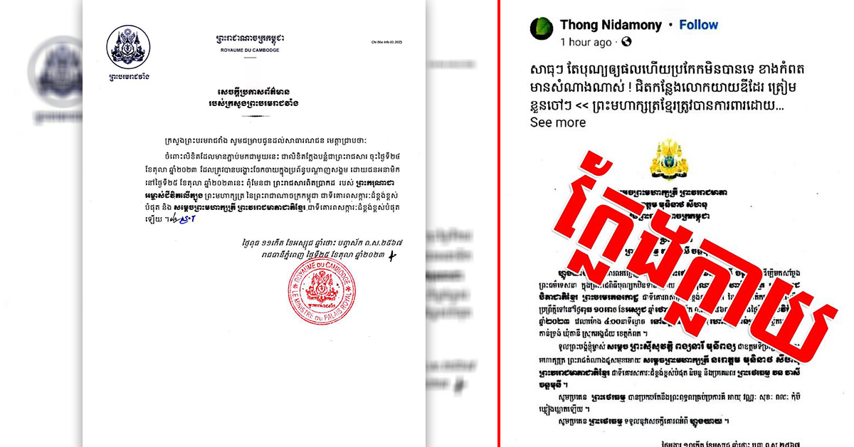 (ភ្នំពេញ)៖ ក្រសួងព្រះបរមរាជវាំង នៅរសៀលថ្ងៃទី២៥ ខែតុលា ឆ្នាំ២០២៣នេះ បានចេញមកបដិសេធព្រះរាជសារក្លែងក្លាយ ដែលបានសរសេរនិមន្ដ ព្រះធម្មវនវាសី ចន្ទមុនី ព្រះសង្ឃាធិបតី វត្តចន្ទប្បជោត្តនារាម (ហៅវត្តតាសុត) និមន្ដទៅសម្ដែងព្រះធម៌ទេសនា ក្នុងព្រះរាជពិធីបុណ្យកឋិនទានរបស់ ព្រះមហាក្សត្រ និងហ្លូងម៉ែ នៅវត្តទេពវិមាន (ហៅវត្តកាន់ទ្រង់) ស្ថិតនៅឃុំតានី ស្រុកអង្គរជ័យ ខេត្តកំពត។ លិខិតរបស់ក្រសួងព្រះបរមរាជវាំង ដែលបណ្ដាញព័ត៌មាន Fresh News ទទួលបានបញ្ជាក់យ៉ាងដូច្នេះថា «ក្រសួងព្រះបរមរាជវាំង សូមជម្រាបជូនដល់សាធារណជន មេត្តាជ្រាបថា ចំពោះលិខិតដែលមានភ្ជាប់មកជាមួយនេះ ជាលិខិតក្លែងបន្លំជាព្រះរាជសារ ចុះថ្ងៃទី២៤ ខែតុលា ឆ្នាំ២០២៣