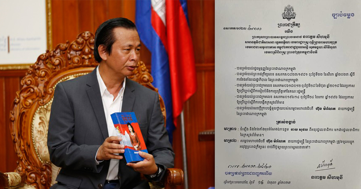 (ភ្នំពេញ)៖ ព្រះករុណា ព្រះបាទសម្តេចព្រះបរមនាថ នរោត្តម សីហមុនី ព្រះមហាក្សត្រនៃកម្ពុជា បានចេញព្រះរាជក្រឹត្យត្រាស់បង្គាប់ដំឡើង និងតែងតាំងមុខតំណែង លោក ឆាយ សុផល ជារដ្ឋលេខាធិការក្រសួងព័ត៌មាន។ នេះបើតាមព្រះរាជក្រឹត្យ ដែលបណ្តាញព័ត៌មាន Fresh News ទទួលបាននៅថ្ងៃទី២១ ខែតុលានេះ៕ ខាងក្រោមនេះ ជាព្រះរាជក្រឹត្យរបស់ព្រះមហាក្សត្រ៖ ផ្តល់សិទ្ធិដោយ៖ freshnews