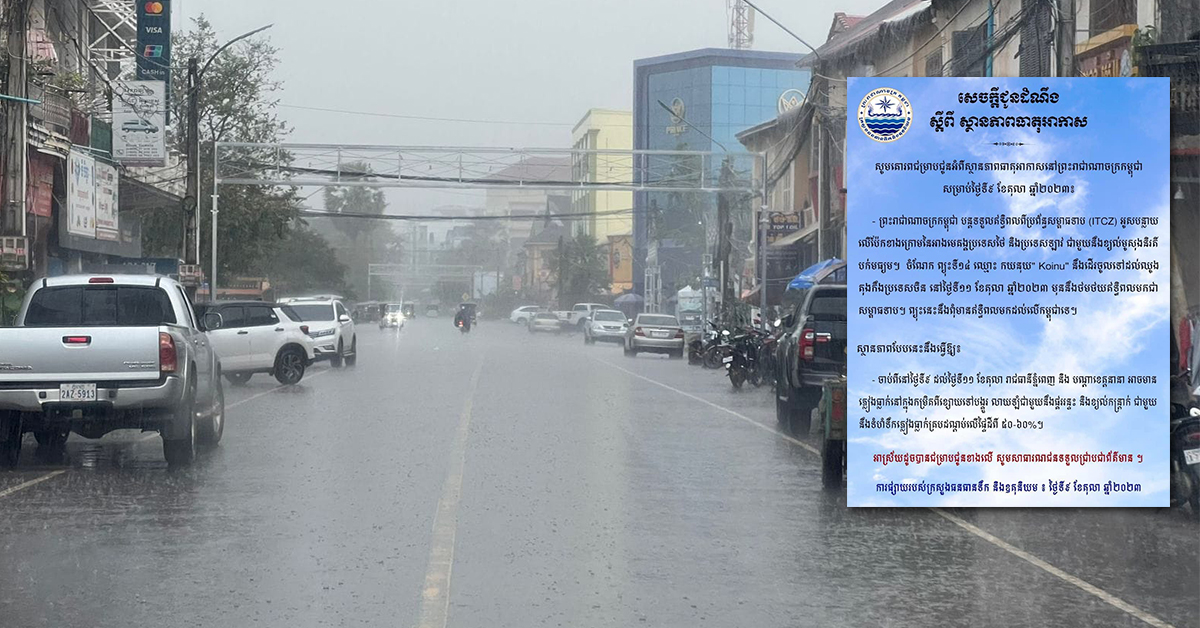 (ភ្នំពេញ)៖ ក្រសួងធនធានទឹក និងឧតុនិយម បានចេញជូនដំណឹង ស្តីពីស្ថានភាពធាតុអាកាសនៅកម្ពុជា សម្រាប់ថ្ងៃទី៩ ខែតុលា ឆ្នាំ២០២៣។ ក្រសួងបញ្ជាក់ថា ចាប់ពីនៅថ្ងៃទី០៩ ដល់ថ្ងៃទី១១ ខែតុលា រាជធានីភ្នំពេញ និងបណ្តាខេត្តនានា អាចមានភ្លៀងធ្លាក់នៅក្នុងកម្រិតពីខ្សោយទៅបង្គួរ លាយឡំជាមួយនឹងផ្គររន្ទះ និងខ្យល់កន្ត្រាក់ ជាមួយនឹងទំហំទឹកភ្លៀងធ្លាក់គ្របដណ្តប់លើផ្ទៃដីពី ៥០-៦០%៕ ផ្តល់សិទ្ធិដោយ៖ freshnews