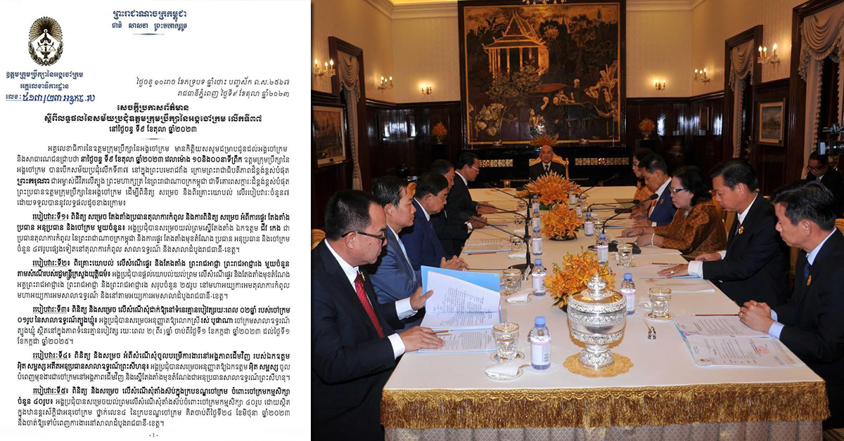 (ភ្នំពេញ)៖ ឧត្តមក្រុមប្រឹក្សានៃអង្គចៅក្រម នៅរសៀលថ្ងៃទី៩ ខែតុលា ឆ្នាំ២០២៣នេះ ចេញសេចក្តីប្រកាសព័ត៌មានពីលទ្ធផល នៃសម័យប្រជុំ លើកទី៣៧ ក្រោមព្រះរាជាធិបតីភាពដ៏ខ្ពង់ខ្ពស់បំផុត របស់ព្រះករុណា ជាអម្ចាស់ជីវិតលើត្បូង ព្រះមហាក្សត្រ នៃព្រះរាជាណាចក្រកម្ពុជា។ សម័យប្រជុំបានពិនិត្យ និងសម្រេចលើរបៀបវារៈចំនួន ៧ ក្នុងនោះរបៀបវារៈទី១ មានការសម្រេចស្នើតែងតាំងលោក ជីវ កេង ជាប្រធានតុលាការកំពូល។ សម័យប្រជុំបានពិនិត្យ សម្រេច និងពិគ្រោះយោបល់ លើរបៀបវារៈចំនួន៧ ដោយទទួលបាននូវលទ្ធផលដូចខាងក្រោម៖ របៀបវារៈទី១៖ ពិនិត្យ សម្រេច តែងតាំងប្រធានតុលាការកំពូល និងការពិនិត្យ សម្រេច អំពីការផ្ទេរ តែងតាំងប្រធាន