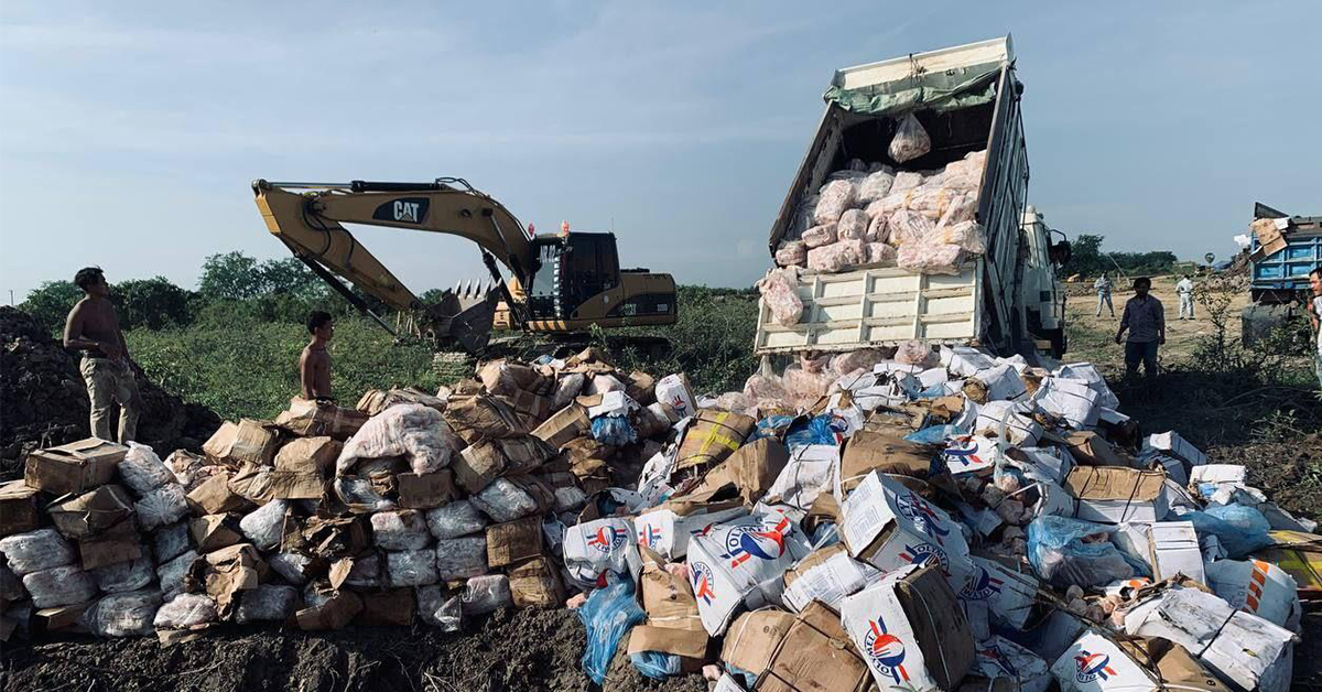 (កណ្ដាល)៖ សាខាគយ និងរដ្ឋាករខេត្តកណ្ដាល សហការជាមួយសាខាការពារអ្នកប្រើប្រាស់ កិច្ចការប្រកួតប្រជែង និងបង្ក្រាបការក្លែងបន្លំ (កបប) ខេត្តកណ្តាល និងអាជ្ញាធរមូលដ្ឋាន បានដុតកម្ទេចចោលសាច់បង្កក សរុបចំនួន១៤តon ក្រោយចាប់បានជាបន្តបន្ទាប់។ ប្រតិបត្តិការនេះធ្វើឡើងនាថ្ងៃទី១៨ ខែសីហា ឆ្នាំ២០២៣ ដឹកនាំដោយលោក អន ស៊ីនួន ប្រធានសាខាគយ និងរដ្ឋាករខេត្តកណ្តាល។ លោក អន ស៊ីនួន បានឱ្យដឹងថា សាច់បង្កកទាំងដែលចាប់បានរួមមាន៖ សាច់ត្រីប្រាបង្កកចំនួន ២៤៨ដុំ ទម្ងន់ ៤,៩៦០គីឡូក្រាម, សាច់ក្រពើបង្កកចំនួន ២០០ កេស ទម្ងន់ ៤,០០០គីឡូក្រាម