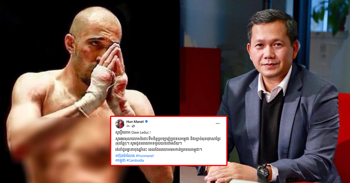 (ភ្នំពេញ)៖ ឯកឧត្តមកិតិ្តទេសាភិបាលបណ្ឌិត ហ៊ុន ម៉ាណែត នាយករដ្ឋមន្រ្តីចាត់តាំង នៃព្រះរាជាណាចក្រកម្ពុជា បានបើកភ្លើងខៀវ ចំពោះសំណើរបស់ស្ដេចប្រដាល់មីយ៉ាន់ម៉ា Dave Leduc បន្ទាប់ពីកីឡាករជើងខ្លាំងរូបនេះ ស្នើចង់ជួប និងចាប់ដៃឯកឧត្តមកិតិ្តទេសាភិបាលបណ្ឌិត ពេលរូបគេមកប្រកួតក្រោមទម្រង់ប្រដាល់គុនខ្មែរ ជាមួយកីឡាករកម្ពុជានាចុងឆ្នាំ២០២៣នេះ។ ឯកឧត្តមកិតិ្តទេសាភិបាលបណ្ឌិត បានឆ្លើយតបតាមរយៈបណ្ដាញសង្គមផ្លូវការនៅព្រឹកថ្ងៃទី១៥ ខែសីហានេះថា «សួស្ដីលោក Dave Leduc! សូមអរគុណលោកចំពោះទឹកចិត្តស្រឡាញ់ប្រទេសកម្ពុជា និងក្បាច់គុនបុរាណខ្មែរ (គុនខ្មែរ)។ សូមជូនពរលោកទទួលបានជោគជ័យ។ រង់ចាំជួបគ្នានៅប្រទេសកម្ពុជានាចុងឆ្នាំនេះពេលដែលលោកមកកាន់ប្រទេសកម្ពុជា»។ គួរដឹងថា កាលពីល្ងាចថ្ងៃចន្ទម្សិលមិញ Dave Leduc បានបង្ហោះសំណេរជាសាភាខ្មែរ លើទំព័រហ្វេសប៊ុកផ្លូវការរបស់ខ្លួនថា «ខ្ញុំសូមអបអរសាទរឯកឧត្ដមបណ្ឌិត ហ៊ុន