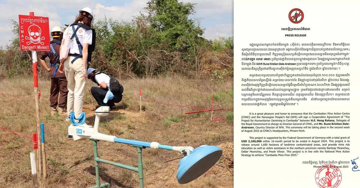 (ភ្នំពេញ)៖ អង្គភាពស៊ីម៉ាក់ និងអង្គការជំនួយរបស់ប្រជាជនណ័រវេស្ស (NPA) នឹងរៀបចំពិធីចុះហត្ថលេខាលើ «កិច្ចព្រមព្រៀងសហប្រតិបត្តិការ គម្រោងបោសសម្អាតមីនមនុស្សធម៌នៅកម្ពុជា» រវាងលោក ហេង រតនា ប្រតិភូរាជរដ្ឋាភិបាលទទួលបន្ទុក ជាអគ្គនាយកមជ្ឈមណ្ឌលសកម្មភាពកម្ចាត់មីនកម្ពុជា និងលោក Rune Kristian Dale-Andresen ប្រធានអង្គការ NPA ប្រចាំប្រទេសកម្ពុជា។ ពិធីចុះហត្ថលេខានេះ នឹងប្រព្រឹត្តទៅនៅទីបញ្ជាការស៊ីម៉ាក់ភ្នំពេញ នាសប្តាហ៍ទី២ ក្នុងខែសីហា ឆ្នាំ២០២៣នេះ។ នេះបើតាមសេចក្ដីជូនដំណឹង របស់អង្គភាពស៊ីម៉ាក់ ដែលបណ្ដាញព័ត៌មាន Fresh News ទទួលបាននៅថ្ងៃទី០៣ ខែសីហា ឆ្នាំ២០២៣។ គម្រោងនេះទទួលបានការគាំទ្រជាហិរញ្ញប្បទានឥតសំណងសរុបចំនួន ២,១០០,០០០
