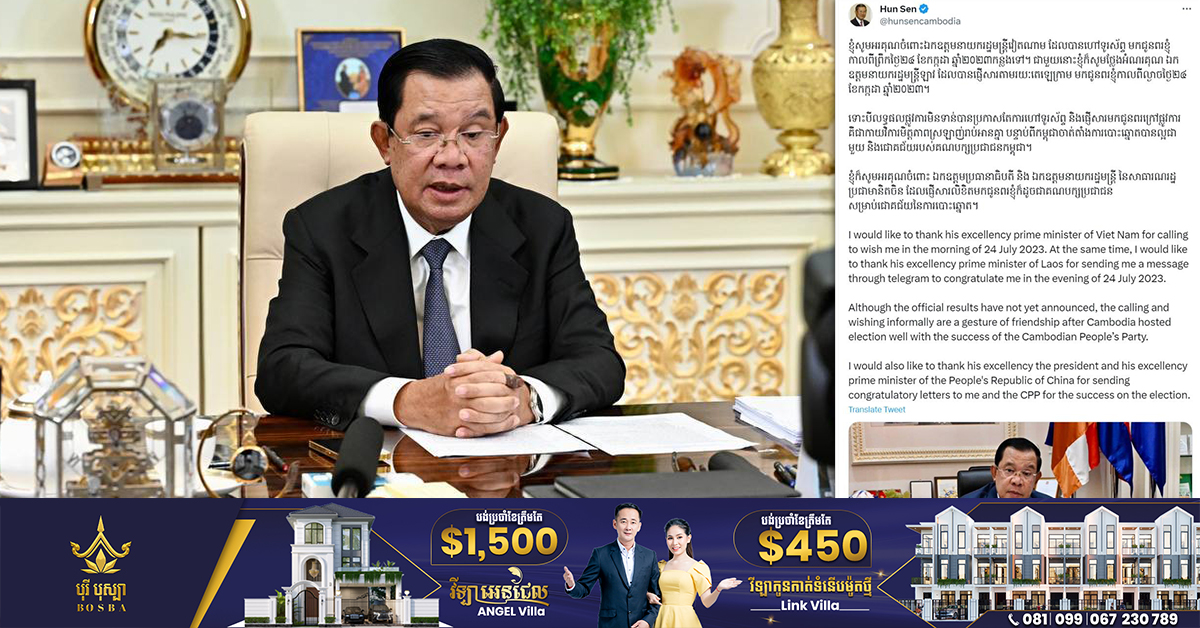(ភ្នំពេញ)៖ នៅរាត្រីថ្ងៃទី២៦ ខែកក្កដា ឆ្នាំ២០២៣នេះ សម្តេចតេជោ ហ៊ុន សែន បានថ្លែងអំណរគុណចំពោះ នាយករដ្ឋមន្រ្តីវៀតណាម, នាយករដ្ឋមន្រ្តីឡាវ ក៏ដូចជាប្រធានាធិបតី និងនាយករដ្ឋមន្រ្តី ចិន ដែលបានទូរស័ព្ទ និងផ្ញើសារជូនពរក្នុងក្នុងឱកាសគណបក្សប្រជាជនកម្ពុជា បន្តទទួលបានជ័យជំនះជាថ្មីទៀត ក្នុងការបោះឆ្នោតជ្រើសតាំងតំណាងរាស្រ្ត អាណត្តិទី៧។ តាមរយៈបណ្តាញ Twitter ផ្លូវការរបស់សម្តេចតេជោ បានបញ្ជាក់យ៉ាងដូច្នេះថា៖ ខ្ញុំសូមអរគុណចំពោះឯកឧត្តមនាយករដ្ឋមន្ត្រីវៀតណាម ដែលបានហៅទូរស័ព្ទ មកជូនពរខ្ញុំកាលពីព្រឹកថ្ងៃ២៤ ខែកក្កដា ឆ្នាំ២០២៣កន្លងទៅ។ ជាមួយនោះខ្ញុំក៏សូមថ្លែងអំណរគុណ ឯកឧត្តមនាយករដ្ឋមន្ត្រីឡាវ ដែលបានផ្ញើសារតាមរយៈតេឡេក្រាម មកជូនពរខ្ញុំកាលពីល្ងាចថ្ងៃ២៤ ខែកក្កដា ឆ្នាំ២០២៣។ ទោះបីលទ្ធផលផ្លូវការមិនទាន់បានប្រកាសតែការហៅទូរស័ព្ទ