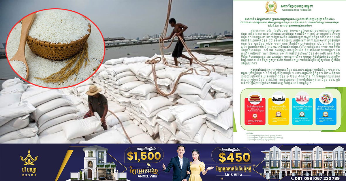 (ភ្នំពេញ)៖ ឆមាសទី១ នៃឆ្នាំ២០២៣ ប្រទេសកម្ពុជាបានសម្រេចការនាំចេញអង្ករបានចំនួន ៣៣ម៉ឺនតោន ដែលគិតជាទឹកប្រាក់មានចំនួន ២២៩.២៣លានដុល្លារសហរដ្ឋអាមេរិក។ នេះបេីតាមសេចក្ដីប្រកាសព័ត៌មាន របស់សហព័ន្ធស្រូវអង្ករកម្ពុជា ដែលបណ្ដាញព័ត៌មាន Fresh News ទទួលបាននៅថ្ងៃទី០៦ ខែកក្កដា ឆ្នាំ២០២៣។ សហព័ន្ធស្រូវអង្ករកម្ពុជាបានបញ្ជាក់ថា ក្នុងរយៈពេល ៦ខែ នៃឆ្នាំ២០២៣ ប្រទេសកម្ពុជាបានសម្រេចការនាំចេញអង្ករបានចំនួន ៣២៩,៦៣៣តោន ទៅកាន់គោលដៅចំនួន ៥២លើពិភពលោក ដោយក្រុមហ៊ុននាំចេញចំនួន ៥០ ដែលក្នុងនោះទៅកាន់ប្រទេសចិន និងតំបន់រដ្ឋបាលស្វយ័តចំនួន ១៣៨,៣៦៤ តោន គិតជាទឹកប្រាក់មានចំនួន៨៨.៩៦លានដុល្លាសហរដ្ឋអាមេរិក ទៅកាន់ប្រទេសនៅក្នុងទ្វីបអឺរ៉ុបចំនួន ២៥ បានចំនួន ១២២,១១៧