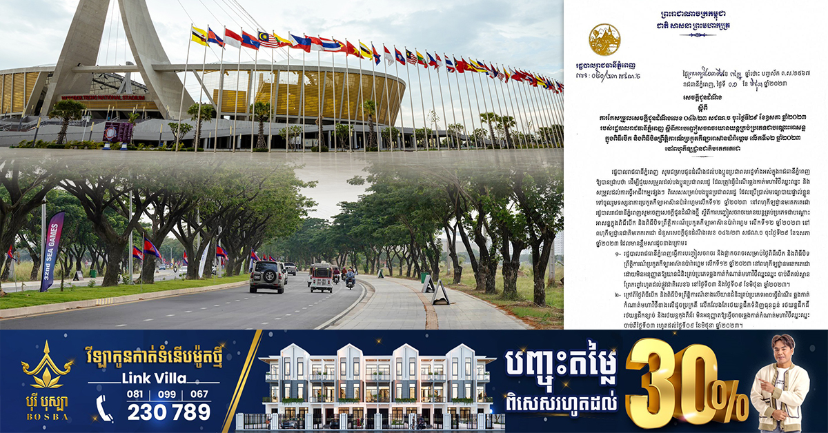 (ភ្នំពេញ)៖ រដ្ឋបាលរាជធានីភ្នំពេញ បានចេញសេចក្ដីជូនដំណឹង ស្ដីពី ការកែសម្រួលសេចក្ដីជូនដំណឹងលេខ ០៤៦/២៣ សជណ.ច ចុះថ្ងៃទី២៩ ខែឧសភា ឆ្នាំ២០២៣ ស្ដីពី ការបញ្ចៀសចរាចរ យានយន្ដគ្រប់ប្រភេទ ជាបណ្ដោះអាសន្ន ក្នុងពិធីបើក និងពិធីបិទព្រឹត្ដិការណ៍ប្រកួតកីឡាអាស៊ានប៉ារ៉ាហ្គេម លើកទី១២ ឆ្នាំ២០២៣ នៅពហុកីឡាដ្ឋានជាតិមរតកតេជោ៕ ខាងក្រោមនេះ ជាសេចក្ដីជូនដំណឹង របស់រដ្ឋបាលរាជធានីភ្នំពេញ ដែលបណ្ដាញព័ត៌មាន Fresh News នៅថ្ងៃទី០១ ខែមិថុនា ឆ្នាំ២០២៣៖ ផ្តល់សិទ្ធិដោយ៖ freshnews