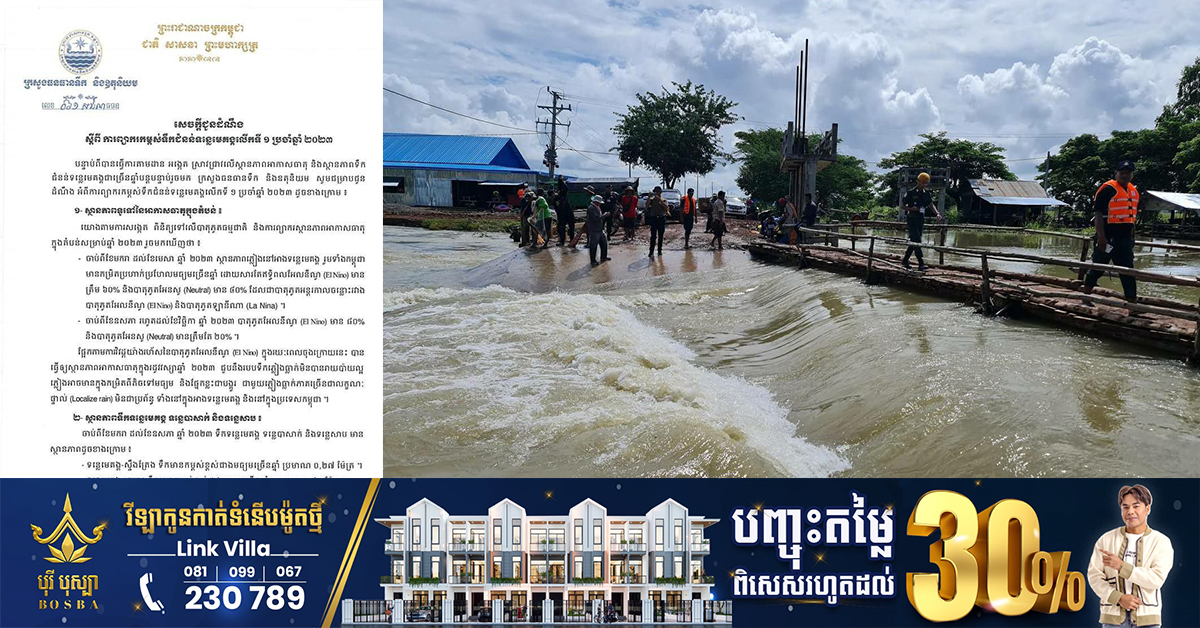 (ភ្នំពេញ)៖ បន្ទាប់ពីបានធ្វើការតាមដាន អង្កេត ស្រាវជ្រាវលើស្ថានភាពអាកាសធាតុ និងស្ថានភាពទឹកជំនន់ទន្លេមេគង្គជាច្រើនឆ្នាំបន្តបន្ទាប់រួចមក ក្រសួងធនធានទឹក និងឧតុនិយម សូមជម្រាបជូនដំណឹងអំពីការព្យាករកម្ពស់ ទឹកជំនន់ទន្លេមេគង្គលើកទី១ ប្រចាំឆ្នាំ២០២៣ ដូចខាងក្រោម៖ ទី១៖ ស្ថានភាពទូទៅនៃអាកាសធាតុក្នុងតំបន់ យោងតាមការសង្កេត ពិនិត្យទៅលើបាតុភូតធម្មជាតិ និងការព្យាករស្ថានភាពអាកាសធាតុក្នុងតំបន់សម្រាប់ឆ្នាំ២០២៣ រួចមកឃើញថា៖ *ចាប់ពីខែមករា ដល់ខែមេសា ឆ្នាំ២០២៣ ស្ថានភាពភ្លៀងនៅអាងទន្លេមេគង្គ រួមទាំងកម្ពុជាមានកម្រិតប្រហាក់ប្រហែលមធ្យមច្រើនឆ្នាំ ដោយសារតែឥទ្ធិពលអែលនីណូ (El Nino) មានត្រឹម ៦០% និងបាតុភូតអែនសូ (Neutral) មាន ៤០% ដែលជាបាតុភូតអន្តរកាលចន្លោះរវាងបាតុភូតអែលនីណូ (El Nino)