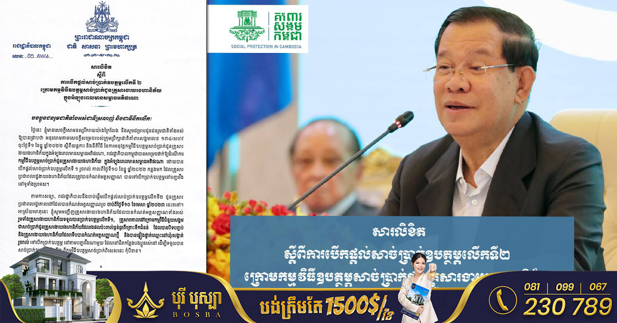 រាជធានីភ្នំពេញ៖ នៅថ្ងៃទី០៧ ខែមេសា ឆ្នាំ២០២៣ យោងតាមការចុះផ្សាយរបស់ ទូរទស្សន៍ជាតិកម្ពុជា ទទក បានឱ្យដឹងថា សម្តេចអគ្គមហាសេនាបតីតេជោ ហ៊ុន សែន អញ្ជើញគ្រួសារងាយ រងហានិភ័យ ក្នុងអំឡុងពេលមានសម្ពាធអតិផរណា ដែលបានកំណត់អត្តសញ្ញាណរួច ទៅបើកប្រាក់ឧបត្ថម្ភចាប់ពីថ្ងៃទី១០ ខែមេសា ឆ្នាំ២០២៣ នេះតទៅ។ សូមបញ្ជាក់កម្មវិធីឧបត្ថម្ភសាច់ប្រាក់ ជូនគ្រួសារងាយរងហានិភ័យ ក្នុងអំឡុងពេលមាមសម្ពាធអតិផរណា គឺជាកម្មវិធីជាតិគាំពារសង្គមមួយទៀត សម្រាប់ជួយគាំពារគ្រួសារងាយរងហានិភ័យ ក្នុងអំឡុងពេលមានសម្ពាធអតិផរណា ប្រមាណ ៥០ម៉ឺនគ្រួសារ ដែលមានការបើកផ្តល់ចំនួន ៣លើក ដោយលើកទីមួយ បានបើកផ្តល់រួចរាល់ នៅថ្ងៃទី១០ ខែធ្នូ ឆ្នាំ២០២២