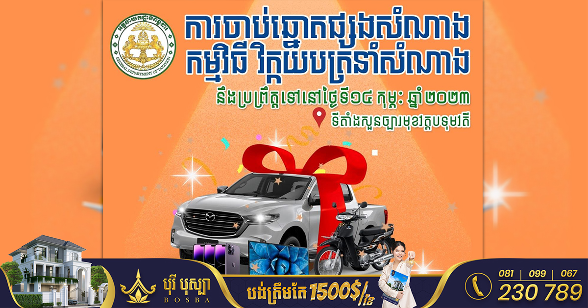 (ភ្នំពេញ)៖ អគ្គនាយកដ្ឋានពន្ធដារបានបញ្ជាក់ថា ការចាប់ឆ្នោតផ្សងសំណាង កម្មវិធី «វិក្កយបត្រនាំសំណាង» នឹងប្រព្រឹត្តទៅនៅថ្ងៃទី១៤ ខែកុម្ភៈ ឆ្នាំ២០២៣ខាងមុខនេះ នៅសួនច្បារមុខវត្តបទុមវតី។ កម្មវិធីទូរស័ព្ទដៃ GDT Lucky Draw App ដែលជាកម្មវិធីវិក្កយបត្រនាំសំណាងនោះ កំពុងទទួលបានការទាក់ទាញចំណាប់អារម្មណ៍ ពីអ្នកជាប់ពន្ធ ក្នុងការថតវិក្កយបត្រផ្ញើចូលមកកម្មវិធីនេះ ដើម្បីទទួលបានរង្វាន់ជាច្រើន។ កម្មវិធី «វិក្កយបត្រនាំសំណាង- GDT Lucky Draw» ត្រូវបានអគ្គនាយកដ្ឋានពន្ធដារ ប្រកាសដាក់ឲ្យប្រើប្រាស់ជាផ្លូវការ កាលពីថ្ងៃទី០៥ ខែឧសភា ឆ្នាំ២០២២ ក្នុងគោលបំណងនៃការកៀងគរព័ត៌មាន ក៏ដូចជាការពង្រឹងនូវអនុលោមភាពថែមទៀត។ ចំពោះវិក្កយបត្រនាំសំណាងនេះមិនថា បងប្អូនប្រជាពលរដ្ឋបានចូលទិញទំនិញក្នុងហាងនានា មិនថាហាងតូច