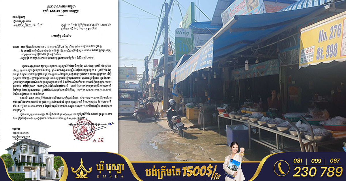 (ភ្នំពេញ)៖ លោក ជា ពិសី អភិបាលខណ្ឌទួលគោក បានចេញសេចក្ដីជូនដំណឹងចំនួន២ ដោយទី១ ទុករយៈពេល៣ខែជាកំហិត ដល់ម្ចាស់អាជីវកម្មទាំងអស់ ឲ្យបញ្ឈប់ជាបន្ទាន់ក្នុងការប្រកបអាជីវកម្មលក់គ្រឿងសមុទ្រ រំលោភលើចិញ្ចើមផ្លូវ និងទ្រូងផ្លូវ ឬតសំយ៉ាបដំបូលផ្ទះរំលោភលើចិញ្ចើមផ្លូវសាធារណៈ ស្ថិតនៅផ្លូវលេខ៥៩៨ ភូមិ១៦ សង្កាត់ទឹកល្អក់ទី១ ខណ្ឌទួលគោក ចាប់ពីថ្ងៃទី២៣ ខែមករា រហូតដល់ថ្ងៃទី២១ ខែមេសា ឆ្នាំ២០២៣។ លោក ជា ពិសី នៅក្នុងសេចក្ដីជូនដំណឹងទី២ បានស្នើឲ្យអស់លោក-លោកស្រីទាំងអស់ ជាម្ចាស់អាជីវកម្មទិញ-លក់រថយន្ដ តុបតែងរថយន្ដ យានដ្ឋានជួសជុលថែទាំរថយន្ដ ទីតាំងលក់គ្រឿងម៉ាស៉ីនរថយន្ដគ្រប់ប្រភេទ ម្ចាស់ទីតាំងទិញ-លក់ម៉ូតូ និងទីតាំងកែច្នៃ-ជួសជុលម៉ូតូ ឲ្យបញ្ឈប់ជាបន្ទាន់ក្នុងការប្រកបអាជីវកម្មរំលោភលើចិញ្ចើមផ្លូវ
