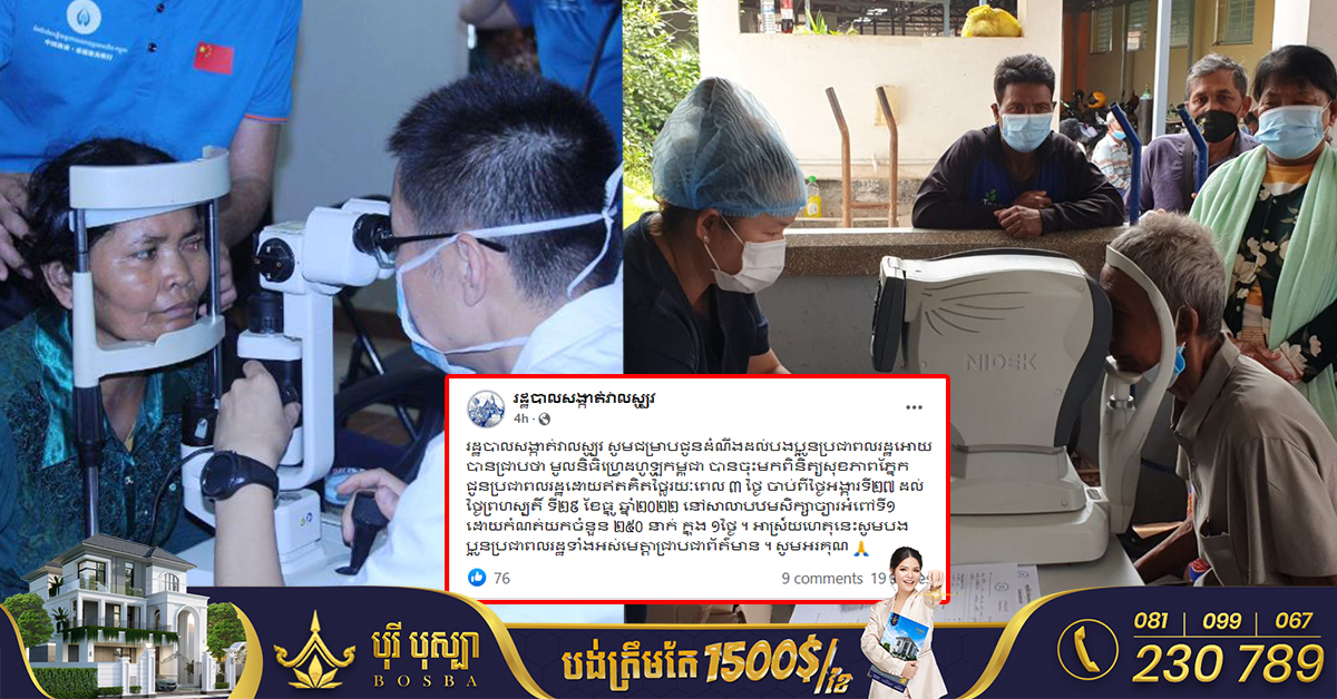 រាជធានីភ្នំពេញ៖ យោងតាមការចុះផ្សាយរបស់ រដ្ឋបាលសង្កាត់វាលស្បូវ នៅថ្ងៃទី២៧ ខែធ្នូ ឆ្នាំ២០២២ បានសូមជម្រាបជូនដំណឹងដល់បងប្អូនប្រជាពលរដ្ឋអោយបានឱ្យជ្រាបថា មូលនិធិហ្វ្រេដហូឡូកម្ពុជា បានចុះមកពិនិត្យសុខភាពភ្នែក ជូនប្រជាពលរដ្ឋដោយឥតគិតថ្លៃរយៈពេល ៣ថ្ងៃ ចាប់ពីថ្ងៃអង្គារទី២៧ ដល់ថ្ងៃព្រហស្បតិ៍ ទី២៩ ខែធ្នូ ឆ្នាំ២០២២ នៅសាលាបឋមសិក្សាច្បារអំពៅទី១។ ដោយកំណត់យកចំនួន ២៥០នាក់ ក្នុង ១ថ្ងៃ អាស្រ័យហេតុនេះសូមបងប្អូនប្រជាពលរដ្ឋទាំងអស់មេត្តាជ្រាបជាព័ត៌មាន សូមអរគុណ ៕ ប្រភព៖ រដ្ឋបាលសង្កាត់វាលស្បូវ