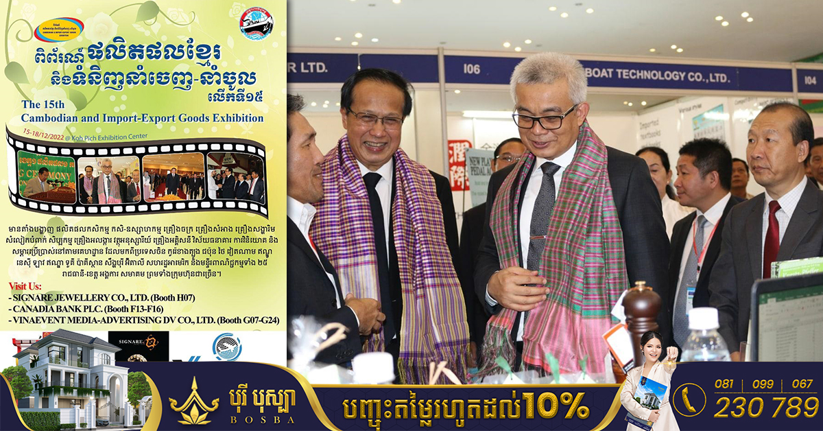 (ភ្នំពេញ)៖ ក្រសួងពាណិជ្ជកម្មកម្ពុជា នឹងរៀបចំ «ពិព័រណ៍ផលិតផលខ្មែរ និងទំនិញនាំចេញ-នាំចូល លើកទី ១៥ ឆ្នាំ២០២២» នៅព្រឹក ថ្ងៃទី ១៥ ខែធ្នូ ឆ្នាំ២០២២ខាងមុខនេះ នៅមជ្ឈមណ្ឌលសន្និបាត និងពិព័រណ៍កោះពេជ្រ រាជធានីភ្នំពេញ។ ពិព័រណ៍នេះធ្វើឡើងក្នុងគោលបំណង ដើម្បីផ្សព្វផ្សាយឲ្យបានទូលំទូលាយ ទាំងថ្នាក់ជាតិ និងអន្តរជាតិ ក្នុងការជំរុញសកម្មភាពពាណិជ្ជកម្ម, បង្កើតឱកាសទីផ្សារ, បង្ហាញពីបរិយាកាស ធុរកិច្ច, និងសក្ដានុពលវិនិយោគ ព្រមទាំងគោលនយោបាយគាំពារ របស់រាជរដ្ឋាភិបាល ចំពោះវិស័យឯកជន។ សម្រាប់ឆ្នាំ២០២២ ពិព័រណ៍ពាណិជ្ជកម្មនេះ មានការចូលរួមគាំទ្រពីបណ្ដាប្រទេស នៅក្នុងតំបន់ជាច្រើនដូចជា៖ ប្រទេសចិន កូរ៉េខាងត្បូង