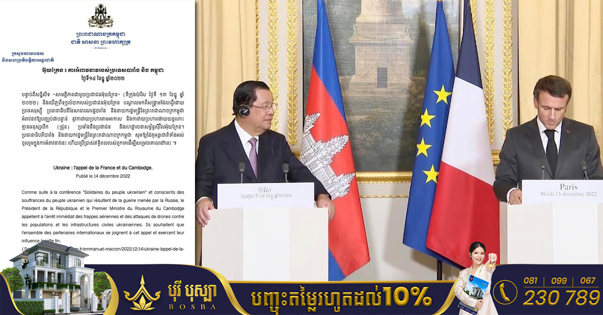 យោងតាមការចុះផ្សាយរបស់ ក្រសួងព័ត៌មាន នៅថ្ងៃទី១៤ ខែធ្នូ ឆ្នាំ២០២២ បានឱ្យដឹងថា ប្រធានាធិបតីនៃសាធារណរដ្ឋបារាំង និងសម្តេចនាយករដ្ឋមន្រ្តីនៃព្រះរាជាណាចក្រកម្ពុជា អំពាវនាវឱ្យបញ្ឈប់ជាបន្ទាន់ នូវការវាយប្រហារតាមអាកាស និងការវាយប្រហារដោយយន្តហោះគ្មានមនុស្សបើក (ដ្រូន) ប្រឆាំងនឹងប្រជាជន និងហេដ្ឋារចនាសម្ព័ន្ធស៊ីវិលអ៊ុយក្រែន។ បន្ទាប់ពីសន្និសីទ “សាមគ្គីភាពជាមួយប្រជាជនអ៊ុយក្រែន» (ទីក្រុងប៉ារីស ថ្ងៃទី១៣ ខែធ្នូ ឆ្នាំ២០២២) និងឃើញពីទុក្ខលំបាករបស់ប្រជាជនអ៊ុយក្រែន បណ្ដាលមកពីសង្គ្រាមដែលធ្វើដោយ ប្រទេសរុស្ស៊ី ប្រធានាធិបតីនៃសាធារណរដ្ឋបារាំង និងនាយករដ្ឋមន្ត្រីនៃព្រះរាជាណាចក្រកម្ពុជា អំពាវនាវឱ្យបញ្ឈប់ជាបន្ទាន់នូវការវាយប្រហារតាមអាកាស និងការវាយប្រហារដោយយន្តហោះ គ្មានមនុស្សបើក (ដូន) ប្រឆាំងនឹងប្រជាជន និងហេដ្ឋារចនាសម្ព័ន្ធស៊ីវិលអ៊ុយក្រែន។ ប្រធានាធិបតីបារាំង និងនាយករដ្ឋមន្ត្រីនៃព្រះរាជាណាចក្រកម្ពុជា សូមឱ្យដៃគូអន្តរជាតិទាំងអស់