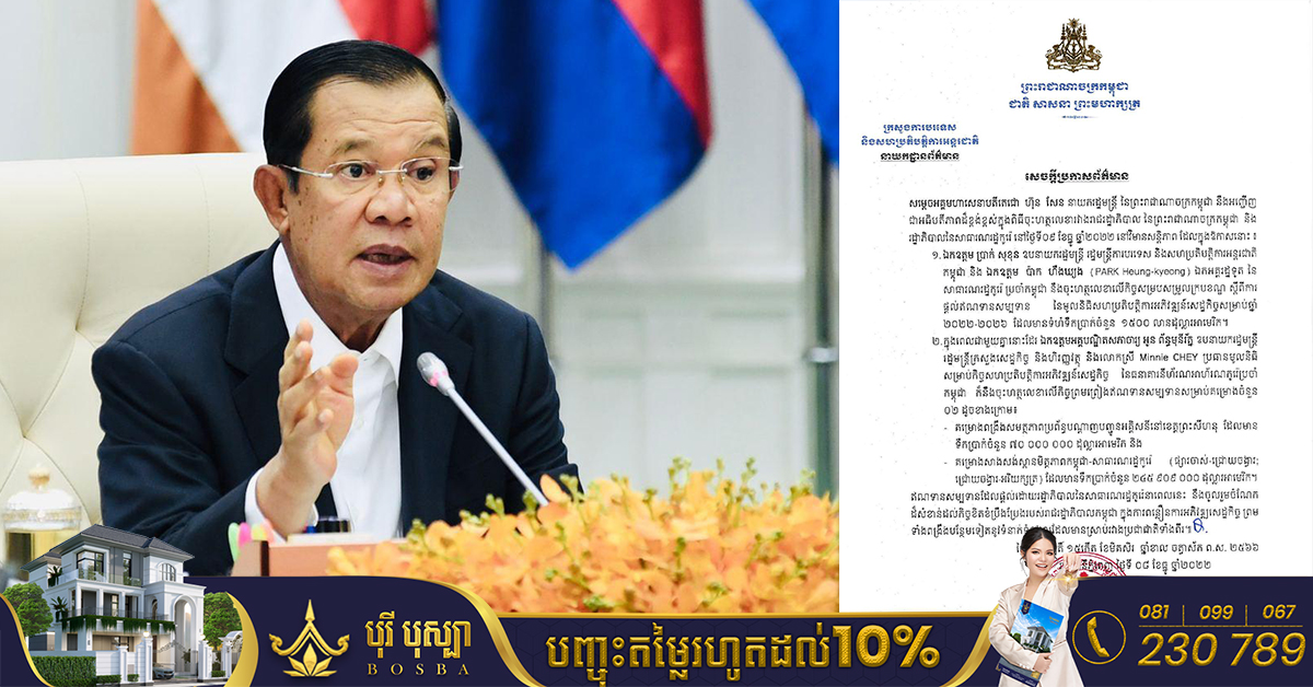 រាជធានីភ្នំពេញ៖ យោងតាមការចុះផ្សាយរបស់ ក្រសួងព័ត៌មាន នៅថ្ងៃទី០៩ ខែធ្នូ ឆ្នាំ២០២២ បានឱ្យដឹងថា សម្តេចអគ្គមហាសេនាបតីតេជោ ហ៊ុន សែន នាយករដ្ឋមន្ត្រីនៃព្រះរាជាណាចក្រកម្ពុជា នឹងអញ្ជើញជាអធិបតីភាពដ៏ខ្ពង់ខ្ពស់ក្នុងពិធីចុះហត្ថលេខារវាងរាជរដ្ឋាភិបាលនៃព្រះរាជា ណាចក្រកម្ពុជា និងរដ្ឋាភិបាលនៃសាធារណរដ្ឋកូរ៉េស្តីពីការផ្តល់ឥណទានសម្បទាន ដែលមានទំហំទឹកប្រាក់ ១ ៥០០ លានដុល្លារ និងកិច្ចព្រមព្រៀងឥណទានសម្បទានលើគម្រោងចំនួនពីរ ដែលមានទឹកប្រាក់ចំនួន ៣១៥ លានដុល្លារ ដល់កម្ពុជា នាព្រឹកថ្ងៃទី០៩ ខែធ្នូ ឆ្នាំ២០២២ នៅវិមានសន្តិភាព។ នេះបើយោងតាមសេចក្តីប្រកាសព័ត៌មានរបស់ក្រសួងការបរទេស និងសហប្រតិបត្តិការអន្ដរជាតិ នាថ្ងៃទី ០៨ ខែ ធ្នូ ឆ្នាំ២០២២នេះ។