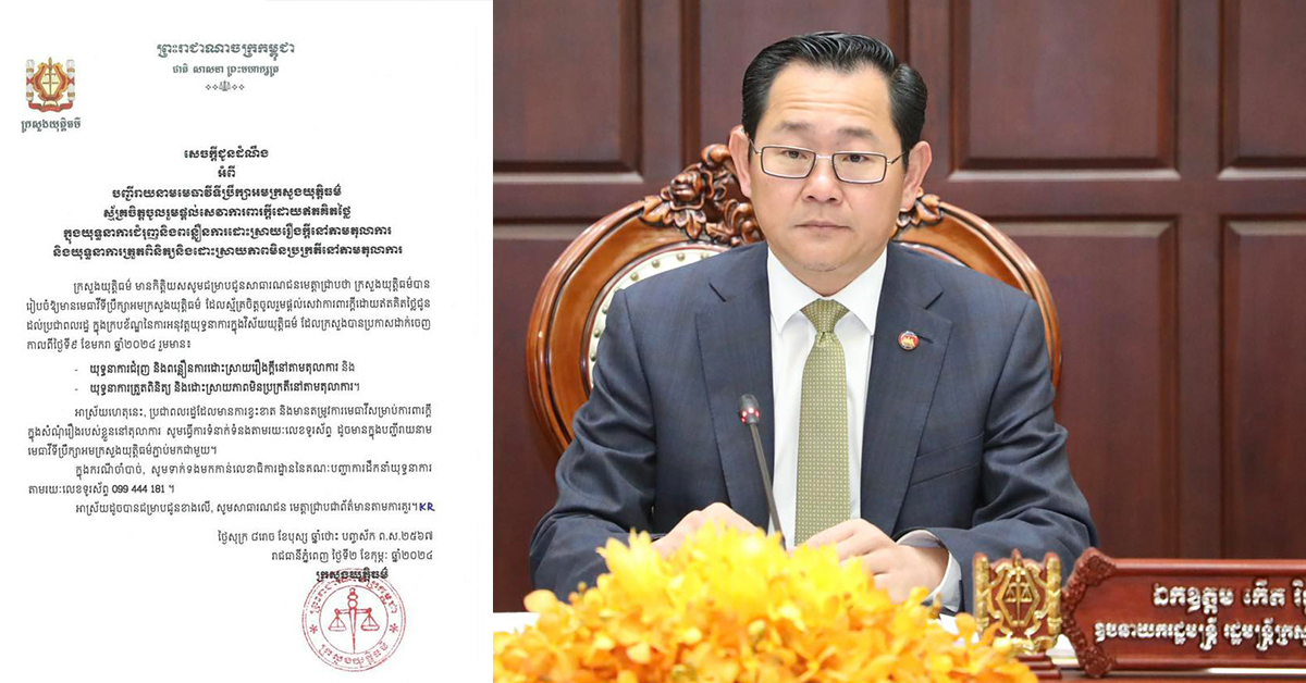 (ភ្នំពេញ)៖ ក្រុមការងារព័ត៌មាន និងទំនាក់ទំនងសាធារណៈ នៃគណៈបញ្ជាការដឹកនាំយុទ្ធនាការជំរុញ និងពន្លឿនការដោះស្រាយរឿងក្តីនៅតាមតុលាការ និងយុទ្ធនាការត្រួតពិនិត្យ និងដោះស្រាយភាពមិនប្រក្រតីនៅតាមតុលាការនៃក្រសួងយុត្តិធម៌ បង្ហាញបញ្ជីឈ្មោះមេធាវីទីប្រឹក្សាអមក្រសួងយុត្តិធម៌ ស្ម័គ្រចិត្តផ្តល់សេវាការពារក្តីដោយឥតគិតថ្លៃ ក្នុងយុទ្ធនាការជំរុញ និងពន្លឿនការដោះស្រាយរឿងក្តីនៅតាមតុលាការ និងយុទ្ធនាការត្រួតពិនិត្យ និងដោះស្រាយភាពមិនប្រក្រតីនៅតាមតុលាការ។ សូមបញ្ជាក់ថា ចំពោះសាធារណជនដែលយល់ឃើញថា ពាក្យបណ្តឹងរបស់ខ្លួននៅតុលាការមានចំណាត់ការយឺតយ៉ាវ សូមទំនាក់ទំនងមកកាន់ក្រុមការងារទទួលពាក្យបណ្តឹង នៃក្រសួងយុត្តិធម៌ តាមរយៈទូរស័ព្ទលេខ 099 444 181៕ ផ្តល់សិទ្ធិដោយ៖ freshnews