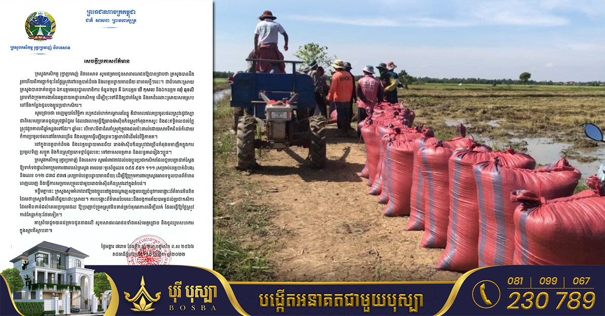 យោងតាមការចុះផ្សាយរបស់ ក្រសួងកសិកម្ម រុក្ខាប្រមាញ់ និងនេសាទ នៅថ្ងៃទី១៦ ខែវិច្ឆិកា ឆ្នាំ២០២២ បានចេញសេចក្តីប្រកាសព័ត៌មាន ឱ្យបានជ្រាបថា ក្រសួងបានដឹង រួចហើយពីការធ្លាក់ចុះនៃថ្លៃស្រូវនៅខេត្តបាត់ដំបង និងខេត្តបន្ទាយមានជ័យ នាពេលថ្មីៗនេះ។ ជាការដំណោះស្រាយ ក្រសួងបានចាត់បញ្ជូន ឯកឧត្តមអនុរដ្ឋលេខាធិការ ចំនួន២រូប គឺ ឯកឧត្តម ឃី កុសល និងឯកឧត្តម ឈុំ ឆុនលី ព្រមទាំងក្រុមការងារនៃអគ្គនាយកដ្ឋានកសិកម្ម ដើម្បីចុះទៅពិនិត្យជាក់ស្ដែង និងរកដំណោះស្រាយសមស្រប នៅនឹងកន្លែងជូនបងប្អូនប្រជាកសិករ។ សូមជ្រាបថា ពេញមួយខែវិច្ឆិកា រហូតដល់ពាក់កណ្ដាលខែធ្នូ គឺជាពេលវេលាប្រមូលផលស្រូវរដូវវស្សា ជាពិសេសប្រភេទពូជស្រូវផ្ការំដួល ដែលជាហេតុធ្វើឱ្យរោងម៉ាស៊ីនកិនស្រូវកំពុងកកស្ទះ