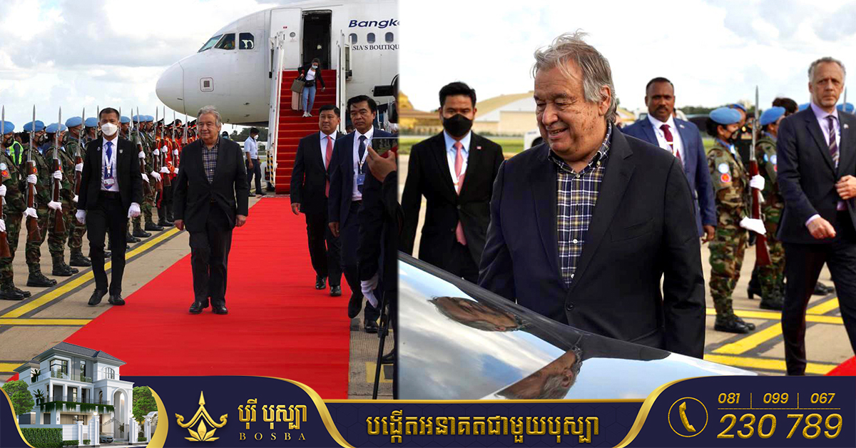 (ភ្នំពេញ)៖ លោក អាន់តូនីញ៉ូ ហ្គូទែរ៉េស (Antonio Guterres) អគ្គលេខាធិការអង្គការសហប្រជាជាតិ (UN) បានអញ្ជើញមកដល់ប្រទេសកម្ពុជាហើយ នៅវេលាម៉ោង២៖៤៥នាទីរសៀល ថ្ងៃទី១១ ខែវិច្ឆិកា ឆ្នាំ២០២២នេះ ដើម្បីចូលរួមកិច្ចប្រជុំកំពូលអាស៊ាន និងកិច្ចប្រជុំកំពូលពាក់ព័ន្ធ ដែលកម្ពុជាធ្វើជាម្ចាស់ផ្ទះ។ កិច្ចប្រជុំកំពូល ដែលកម្ពុជាធ្វើជាម្ចាស់ផ្ទះ ធ្វើឡើងចាប់ផ្តើមពីថ្ងៃទី១០ ដល់ទី១៣ ខែវិច្ឆិកា ឆ្នាំ២០២២ នៅរាជធានីភ្នំពេញ មានព្រឹត្តិការណ៍ដូចជា៖ កិច្ចប្រជុំកំពូលអាស៊ានលើកទី៤០ និងលើកទី៤១ កិច្ចប្រជុំកំពូលអាស៊ាន-ចិន លើកទី២៥ កិច្ចប្រជុំកំពូលអាស៊ាន-ជប៉ុន លើកទី២៥ កិច្ចប្រជុំកំពូលអាស៊ាន-សាធារណរដ្ឋកូរ៉េ លើកទី២៣ កិច្ចប្រជុំកំពូលអាស៊ានបូកបី លើកទី២៥