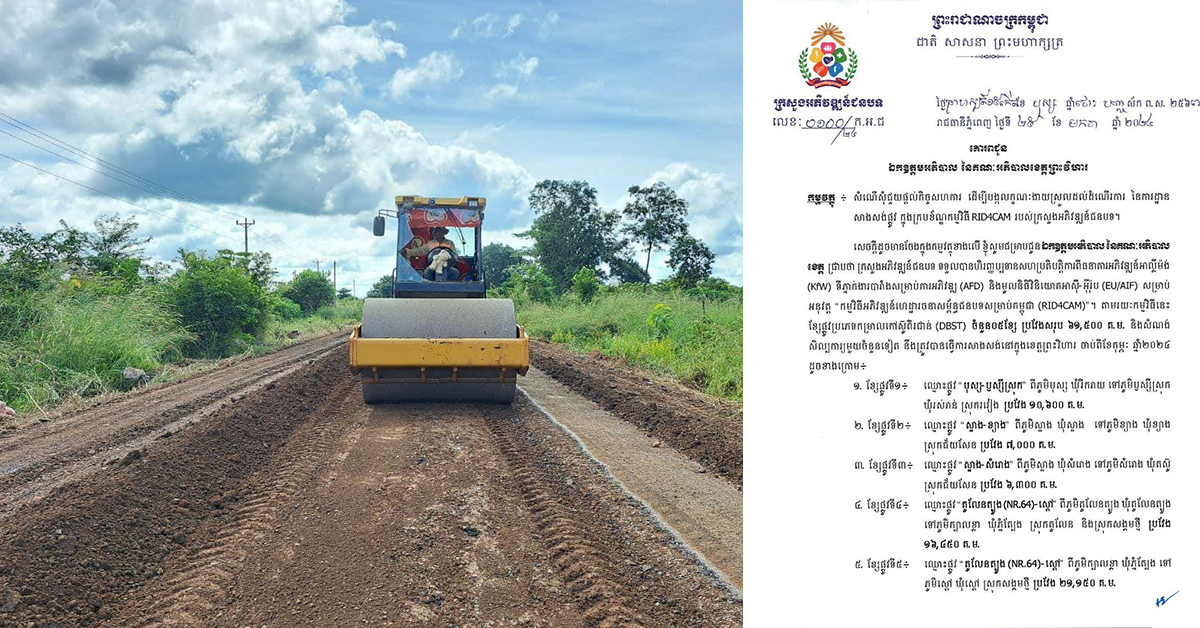(ព្រះវិហារ)៖ ផ្លូវក្រាលកៅស៊ូ ២ស្រទាប់ស្តើង ប្រភេទ (DBST) ចំនួន៥ខ្សែមានប្រវែងសរុប ៦១.៥០០គីឡូម៉ែត្រ និងសំណង់សិល្បការមួយចំនួនទៀត នឹងត្រូវបានសាងសង់នៅខេត្តព្រះវិហារ ចាប់ពីខែកុម្ភៈ ឆ្នាំ២០២៤តទៅ។ បើតាមសេចក្តីជូនដំណឹងរបស់ក្រសួងអភិវឌ្ឍន៍ជនបទ ដែលបណ្តាញព័ត៍មាន Fresh News ទទួលបាននូវរសៀលថ្ងៃទី០១ ខែកុម្ភៈ ឆ្នាំ២០២៤នេះ បានឱ្យដឹងទៀតថា ផ្លូវទាំង៥ខ្សែដែលគ្រោងសាងសង់ចាប់ពីខែកុម្ភៈនេះរួមមាន៖ *ខ្សែផ្លូវទី១ ឈ្មោះផ្លូវ «បុស្ស-ឫស្សីស្រុក» ពីភូមិបុស្ស ឃុំរីករាយ ទៅភូមិឫស្សីស្រុក ឃុំរួសរាន់ ស្រុករវៀង ប្រវែង ១០.៦០០គីឡូម៉ែត្រ។ *ខ្សែផ្លូវទី២ ឈ្មោះផ្លូវ «ស្អាង-ខ្យង» ពីភូមិស្អាង
