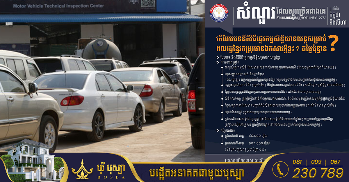 រាជធានីភ្នំពេញ៖ យោងតាមការចុះផ្សាយរបស់ ក្រសួងសាធារណការ និងដឹកជញ្ជូន នៅថ្ងៃទី២៣ ខែកញ្ញា ឆ្នាំ២០២២ បានឱ្យដឹងថា ក្រសួងសាធារណការ បានឆ្លើយសំណួរ ដែលសួរច្រើនជាងគេប្រចាំខែកក្កដា និងសីហា តាមរយៈលេខទូរស័ព្ទ (HOTLINE ៖ 1275) ដោយបានសួរថា៖ តើបែបបទនីតិវិធីផ្ទេរកម្មសិទ្ធិយានយន្តសម្រាប់ពលរដ្ឋខ្មែរតម្រូវមានឯកសារអ្វីខ្លះ? តម្លៃប៉ុន្មាន? ក្រសួងសាធារណ បានបញ្ជាក់ឱ្យដឹងថា៖ បែបបទ និងនីតិវិធីផ្ទេរកម្មសិទ្ធិសម្រាប់ពលរដ្ឋខ្មែរ។ ឯកសារតម្រូវ៖ -ពាក្យសុំផ្ទេរកម្មសិទ្ធិ ដែលមានលេខកាល់លេខតួ ឬលេខសាក់ស៊ី (ដែលចម្លងជាក់ស្តែងពីយានយន្ត) -អត្តសញ្ញាណអ្នកលក់ និងអ្នកទិញ៖ *ពលរដ្ឋខ្មែរ៖ អត្តសញ្ញាណប័ណ្ណសញ្ជាតិខ្មែរ (ច្បាប់ចម្លងដែលមានបញ្ជាក់ពីអាជ្ញាធរមានសមត្ថកិច្ច) -បណ្ណសម្គាល់យានជំនិះ