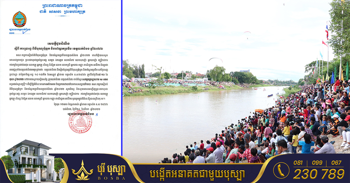 ខេត្តបាត់ដំបង៖ យោងតាមការចុះផ្សាយរបស់ រដ្ឋបាលខេត្តបាត់ដំបង នៅថ្ងៃទី២៦ ខែសីហា ឆ្នាំ២០២២ បានចេញសេចក្ដីជូនដំណឹង ស្ដីពីការប្រារព្ធពិធីបុណ្យអុំទូក និងបណ្ដែតប្រទីប ខេត្តបាត់ដំបង ឆ្នាំ២០២២ នាថ្ងៃទី ០៩-១០ ខែតុលា ឆ្នាំ២០២២។ គណៈកម្មការរៀបចំពិធីបុណ្យអុំទូក និងបណ្ដែតប្រទីបខេត្តបាត់ដំបង ឆ្នាំ២០២២ មានកិត្តិយសសូមគោរពជម្រាបជូន សាធារណជនទាំងអស់ទូទាំងខេត្តបាត់ដំបងមេត្តាជ្រាបថា៖ ខេត្តបាត់ដំបង នឹងរៀបចំប្រារព្ធពិធីបុណ្យអុំទូក និងបណ្ដែតប្រទីប នៅថ្ងៃចេញព្រះវស្សា នាថ្ងៃអាទិត្យ-ចន្ទ ១៤-១៥កើត ខែអស្សុជ ឆ្នាំខាល ចត្វាស័ក ព.ស២៥៦៦ ត្រូវនឹងថ្ងៃទី០៩-១០ ខែតុលា ឆ្នាំ២០២២ នៅតាមបណ្ដោយស្ទឹងសង្កែ