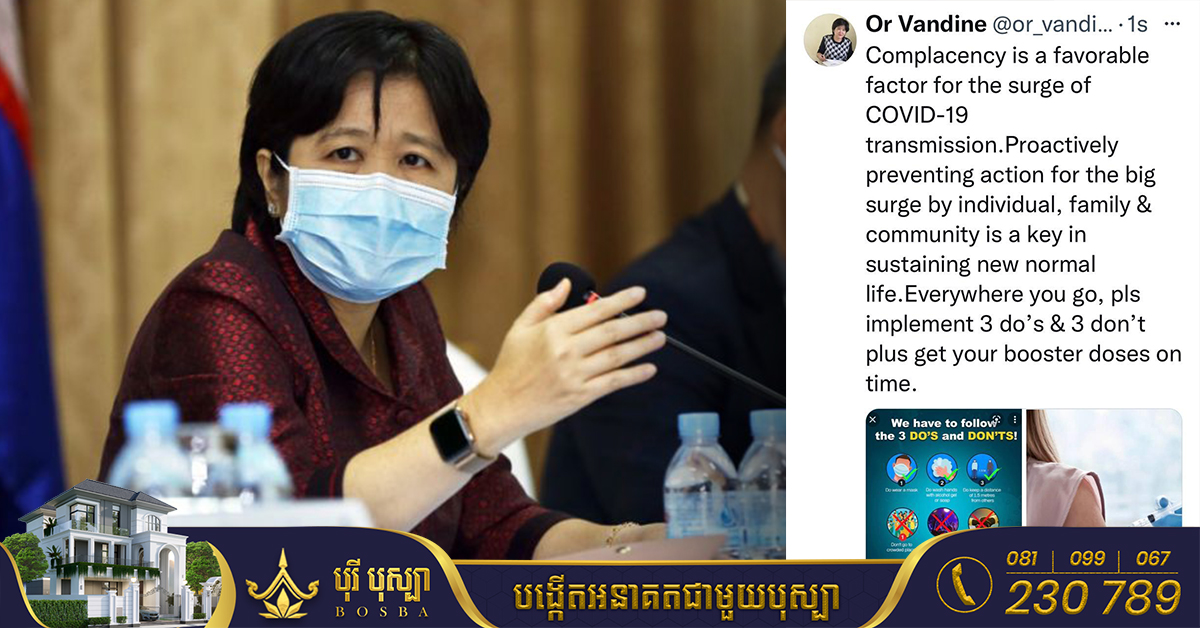 (ភ្នំពេញ)៖ ខណៈមេរោគកូវីដ១៩ នៅបន្តរាលដាលនៅក្នុងប្រទេសនោះ លោកស្រី ឱ វណ្ណឌីន រដ្ឋលេខាធិការ និងជាអ្នកនាំពាក្យក្រសួងសុខាភិបាល នាថ្ងៃទី៤ ខែសីហា ឆ្នាំ២០២២នេះ បានព្រមានសាជាថ្មីថា ការព្រងើយកន្តើយ និងធ្វេសប្រហែសក្នុងការការពារខ្លួនរបស់ប្រជាពលរដ្ឋ គឺជាកត្តាបើកចំហរឱ្យមានការឆ្លងមេរោគកូវីដ កាន់តែកើនឡើង និងលឿនខ្លាំង។ ជាមួយគ្នានោះ លោកស្រីរដ្ឋលេខាធិការ បានអំពាវនាវដល់ប្រជាពលរដ្ឋជាថ្មីទៀតថា ប្រសិនបើទៅទីកន្លែងណាក៏ដោយ សូមនាំគ្នាអនុវត្តវិធានការ «៣ការពារ និង៣កុំ» រួមជាមួយចាក់វ៉ាក់សាំងដូសជំរុញពេលដល់វេន ឱ្យបានទាន់ពេល ដើម្បីសុខភាពផ្ទាល់ខ្លួន។ គួរជម្រាបថា នៅថ្ងៃទី៤ ខែសីហានេះ ក្រសួងសុខាភិបាលបានបង្ហាញព័ត៌មានពីការបន្តរកឃើញអ្នកឆ្លងកូវីដ១៩ចំនួន២៩នាក់ និងជាសះស្បើយចំនួន១៩នាក់។ គិតត្រឹមថ្ងៃទី៤ ខែសីហា