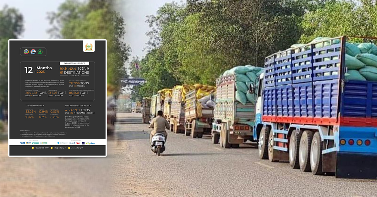 (ភ្នំពេញ)៖ កម្ពុជាទទួលបានទឹកប្រាក់ ១៧០០លានដុល្លារ ពីការនាំចេញអង្ករជាង ៦៥ម៉ឺនតោន និងស្រូវជាង ៤លានតោន នៅរយៈពេល១២ ខែ ឆ្នាំ២០២៣។ នេះបើយោងតាមសេចក្តីជូនដំណឹង របស់សហព័ន្ធស្រូវអង្ករកម្ពុជា ដែលបណ្តាញព័ត៌មាន Fresh News ទទួលបាននៅថ្ងៃទី៥ ខែមករា ឆ្នាំ២០២៤នេះ។ ការនាំចេញអង្ករសំរាប់ឆ្នាំ ២០២៣ មានកំណើនលើបរិមាណ៣% និងបរិមាណទឹកប្រាក់មានកំណើន ១៣% បើធៀបរយៈពេលដូចគ្នាឆ្នាំ ២០២២។ សហព័ន្ធស្រូវអង្ករកម្ពុជាបានឱ្យដឹងថា ពេញមួយឆ្នាំ២០២៣ កម្ពុជាបាននាំចេញអង្ករចំនួន ៦៥៦ ៣២៣ តោន តាមរយៈក្រុមហ៊ុននាំចេញអង្ករចំនួន ៦៣ ក្រុមហ៊ុន