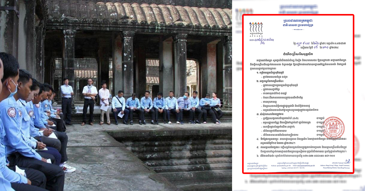 ខេត្តសៀមរាប៖ នៅថ្ងៃទី០៦ ខែមករា ឆ្នាំ២០២៤ យោងតាមការចុះផ្សាយរបស់ អាជ្ញាធរជាតិអប្សរា បានចេញសេចក្ដីជូនដំណឹងដល់សិស្ស និស្សិត និងសាធារណជន ឱ្យបានជ្រាបថា អាជ្ញាធរជាតិអប្សរា នឹងធ្វើការជ្រើសរើសភ្នាក់ងារទេសចរ ចំនួន០៩រូប ឱ្យបម្រើការងារនៅនាយកដ្ឋានអភិវឌ្ឍន៍ទេសចរណ៍ និងវប្បធម៌ ដូចមានបញ្ជាក់ជូនខាងក្រោម៖ ១. កម្រិតមធ្យមសិក្សាទុតិយភូមិ៖ – ភ្នាក់ងារទេសចរចំនួន ០៩រូប ២. លក្ខខណ្ឌនៃការជ្រើសរើស៖ – ត្រូវមានសញ្ញាបត្រមធ្យមសិក្សាទុតិយភូមិ – ត្រូវមានសញ្ជាតិខ្មែរ មានអាយុចាប់ពី១៨-៣៥ឆ្នាំ – ចំណេះដឹងភាសារបរទេសត្រូវបានលើកទឹកចិត្ត – មានសុខភាពល្អ – មិនប្រាសចាកសិទ្ធិខាងផ្លូវរដ្ឋប្បវេណី