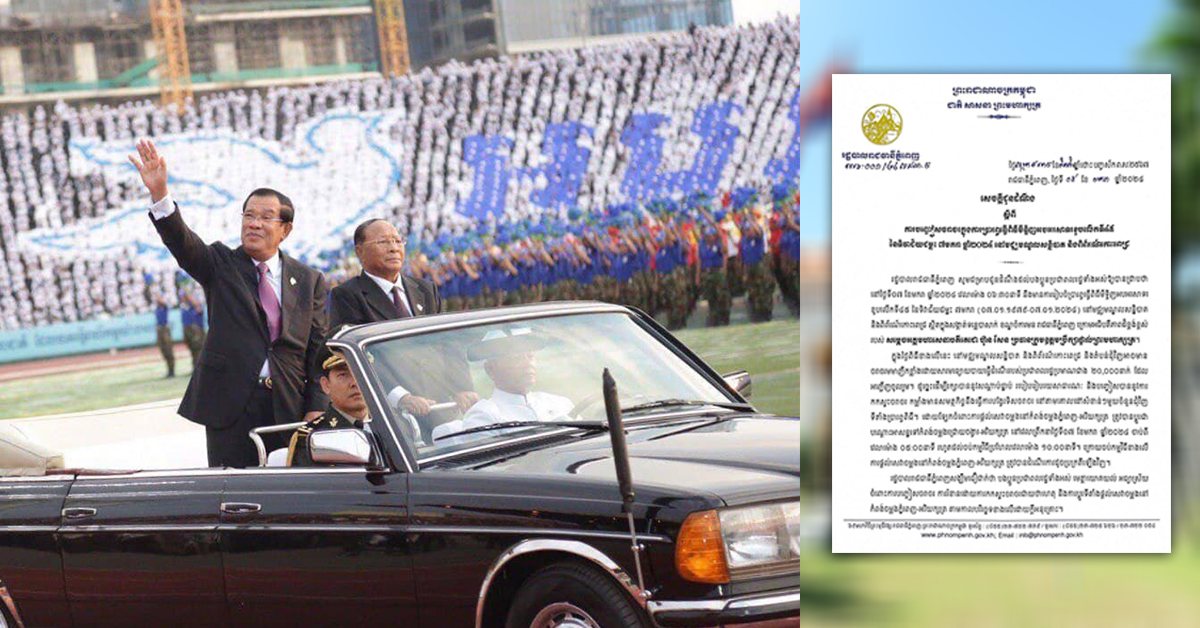 រាជធានីភ្នំពេញ៖ យោងតាមការចុះផ្សាយរបស់ រដ្ឋបាលរាជធានីភ្នំពេញ បានចេញសេចក្ដីជូនដំណឹង ស្ដីពីការបញ្ចៀសចរាចរក្នុងការប្រារព្ធធ្វើពិធីមីទ្ទិញអបអរសាទរខួបលើកទី៤៥ នៃទិវាជ័យជម្នះ ៧មករា ឆ្នាំ២០២៤ នៅមជ្ឈមណ្ឌលសន្និបាត និងពិព័រណ៍កោះពេជ្រ។ រដ្ឋបាលរាជធានីភ្នំពេញ សូមជម្រាបជូនថា នៅថ្ងៃទី០៧ ខែមករា ឆ្នាំ២០២៤ វេលាម៉ោង ០៦៖៣០នាទី នឹងមានការរៀបចំប្រារព្ធធ្វើពិធីមីទ្ទិញអបអរសាទរ ខួបលើកទី៤៥ នៃទិវាជ័យជម្នះ ៧មករា (០៧.០១.១៩៧៩-០៧.០១.២០២៤) នៅមជ្ឈមណ្ឌលសន្និបាត និងពិព័រណ៍កោះពេជ្រ ស្ថិតក្នុងសង្កាត់ទន្លេបាសាក់ ខណ្ឌចំការមន រាជធានីភ្នំពេញ ក្រោមអធិបតីភាពដ៏ខ្ពង់ខ្ពស់ របស់ សម្តេចអគ្គមហាសេនាបតីតេជោ ហ៊ុន សែន ប្រធានក្រុមឧត្តមប្រឹក្សាផ្ទាល់ព្រះមហាក្សត្រ។ ក្នុងថ្ងៃពិធីខាងលើនេះ