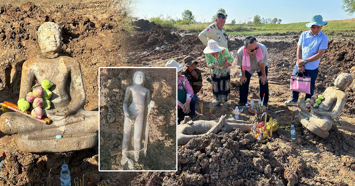(តាកែវ)៖ រូបសំណាកព្រះបដិមាចំនួន ២អង្គ ដោយមួយអង្គឈ និងមួយអង្គទៀតអង្គុយពែនភ្នែន ត្រូវបានប្រជាពលរដ្ឋនៅក្នុងឃុំស្រង៉ែ ស្រុកទ្រាំង ខេត្តតាកែវ បានប្រទះឃើញនៅរសៀលថ្ងៃទី៣ ខែមករា ឆ្នាំ២០២៤ និងបានរាយការណ៍ជូនអាជ្ញាធរ ដើម្បីយកទៅរក្សាទុកជាសម្បត្តិជាតិ។ លោក ឈួន ផាន់នី អភិបាលស្រុកទ្រាំង បានថ្លែងប្រាប់បណ្តាញព័ត៌មាន Fresh News ឱ្យដឹងថា បន្ទាប់ពីទទួលបានដឹងករណីប្រះឃើញរូបបដិមាកនេះ លោកបានរាយការណ៍ទៅរដ្ឋបាលខេត្ត និងមន្ទីរវប្បធម៌ ដើម្បីមកពិនិត្យ និងបានយករូបសំណាកពីប្រជាពលរដ្ឋ ដែលបានប្រទះឃើញឈ្មោះ ហ៊ុយ ហឿន រស់នៅភូមិឃុំខាងលើចំនួន ២ព្រះអង្គ មួយអង្គទ្រង់ឈកំពស់ប្រមាណ ១ម៉ែត្រកន្លះ និងមួយអង្គទៀត