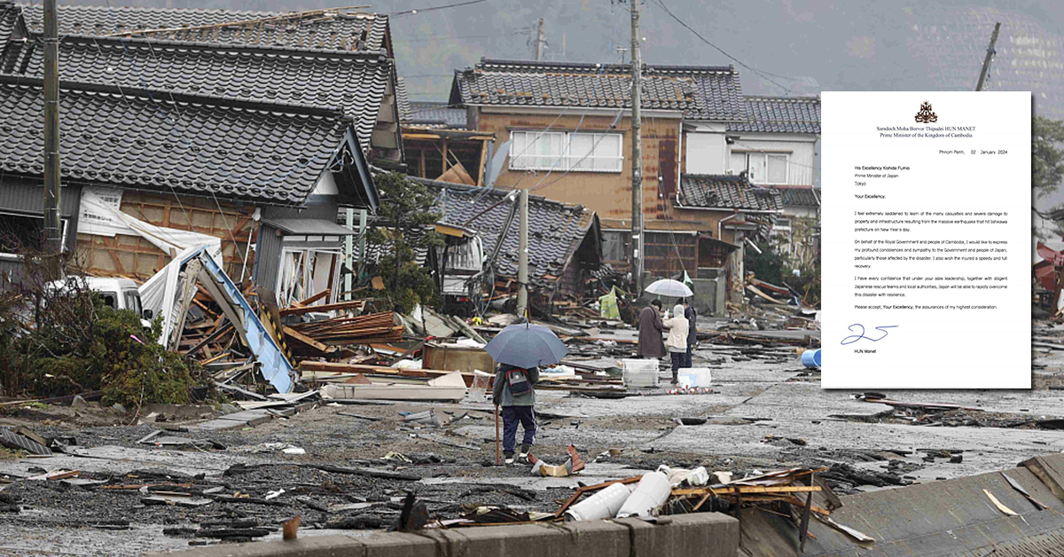 (ភ្នំពេញ)៖ សម្ដេចមហាបវរធិបតី ហ៊ុន ម៉ាណែត នាយករដ្ឋមន្ត្រីនៃកម្ពុជា នាថ្ងៃទី៤ ខែមករា ឆ្នាំ២០២៤នេះ បានផ្ញើសាររំលែកទុក្ខជូនលោក គីស៊ីដា ហ្វូមីអុ នាយករដ្ឋមន្ត្រីជប៉ុន ចំពោះការបាត់បង់ជីវិតប្រជាជនជប៉ុន ព្រមទាំងការខូចខាតហេដ្ឋារចនាសម្ព័ន្ធ ទ្រព្យសម្បត្តិជាច្រើនរបស់ប្រជាជន និងរដ្ឋាភិបាលប្រទេសជប៉ុន ដែលបណ្តាលមកពីការរញ្ជួយដីកាលពីថ្ងៃឆ្លងឆ្នាំថ្មីកន្លងទៅ។ គួរបញ្ជាក់ថា នៅថ្ងៃចន្ទសប្តាហ៍នេះ ប្រទេសជប៉ុនបានរងការវាយប្រហារពីគ្រោះរញ្ជួយដីខ្លាំងៗបន្តបន្ទាប់គ្នា ក្នុងនោះមានដល់កម្រិត៧.៦រ៉ិចទ័រ។ គ្រោះរញ្ជួយដីនេះបានបណ្ដាលឱ្យមនុស្សស្លាប់កើនឡើងដល់៧៨នាក់ គិតត្រឹមថ្ងៃទី៤ ខែមករា ឆ្នាំ២០២៤នេះ និងមានមនុស្សច្រើនជាង៥០នាក់ត្រូវបានរាយការណ៍ថាកំពុងបាត់ខ្លួននៅឡើយ ខណៈក្រុមសង្រ្គោះជប៉ុនបន្តព្យាយាមស្វែងរកពួកគេ។ អាជ្ញាធរជប៉ុនបាននិយាយថា ហេតុការណ៍រញ្ជួយដីដ៏ខ្លាំងក្លាអមដោយរំញ័រកម្រិតផ្សេងៗទៀតនោះ បានបណ្តាលឱ្យមនុស្សចំនួន៣៣០នាក់រងរបួស ខណៈប្រជាពលរដ្ឋប្រហែល២៩,០០០គ្រួសារនៅខេត្តអ៉ីស៊ីកាវ៉ា (Ishikawa) ដែលជាខេត្តមួយជាប់ឆ្នេរសមុទ្រជប៉ុន (Sea