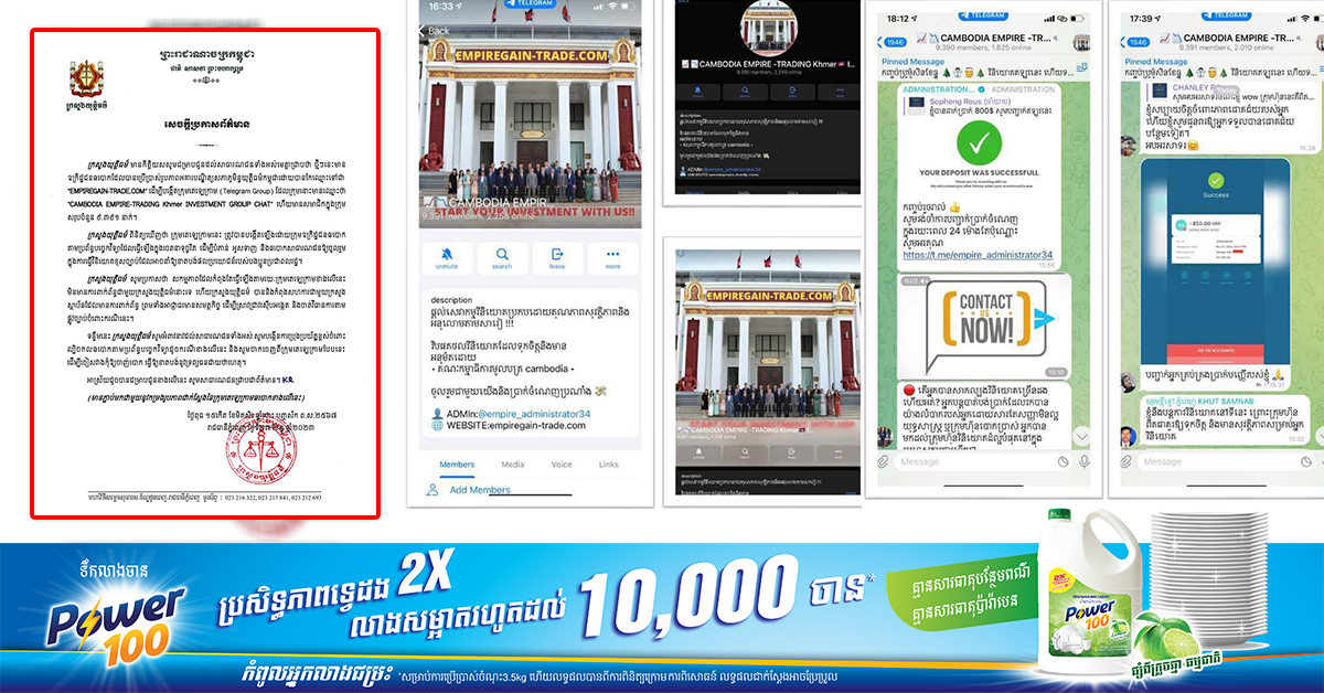 (ភ្នំពេញ)៖ ក្រសួងយុត្តិធម៌ នៅថ្ងៃទី២៨ ខែធ្នូ ឆ្នាំ២០២៣នេះ បានចេញសេចក្ដីប្រកាសព័ត៌មាន ក្រោយថ្មីៗនេះមាន ឧក្រិដ្ឋជនឆបោកដែលបានប្រើប្រាស់រូបភាពអគារបណ្ឌិត្យសភាភូមិន្ទយុត្តិធម៌កម្ពុជា ដោយបានកឈ្មោះទៅជា «EMPIREGAIN-TRADE.COM» ដើម្បីបង្កើតក្រុមតេឡេក្រាម (Telegram Group) ដែលក្រុមនោះមានឈ្មោះថា «CAMBODIA EMPIRE-TRADING _ Khmer INVESTMENT GROUP CHAT» ហើយមានសមាជិកក្នុងក្រុម សរុបចំនួន៩,៣៩១នាក់។ តាមរយៈសេចក្ដីប្រកាសព័ត៌មាន ដែលបណ្ដាញព័ត៌មាន Fresh News ទទួលបាន ក្រសួងយុត្តិធម៌ ពិនិត្យឃើញថា ក្រុមតេឡេក្រាមនេះ ត្រូវបានបង្កើតឡើងដោយក្រុមឧក្រិដ្ឋជនឆបោក តាមប្រព័ន្ធបច្ចេកវិទ្យាដែលធ្វើឡើងក្នុងចេតនាទុច្ចរិត ដើម្បីបំភាន់