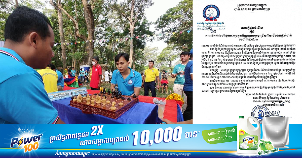(ភ្នំពេញ)៖ សហព័ន្ធកីឡាអុកចត្រង្កកម្ពុជា នាថ្ងៃទី២៧ ខែធ្នូនេះ បានចេញសេចក្តីប្រកាសថា និងរៀបចំការប្រកួតជ្រើសរើសជើងឯកថ្នាក់ជាតិឆ្នាំ២០២៣ ដោយកាលបរិច្ឆេទប្រកួតអុកចត្រង្គ និងធ្វើឡើងនៅថ្ងៃទី១៥-១៧ ខែមករា ឆ្នាំ២០២៤ ហើយទីតាំងប្រកួតនៅសាលដំបូលទូក សាកលវិទ្យាល័យភូមិន្ទភ្នំពេញ RUPP។ ខណៈនេះជាកាលបរិច្ឆេទថ្មី បន្ទាប់ពីដំបូងឡើយសហព័ន្ធកីឡាអុកចត្រង្កកម្ពុជា គ្រោងរៀបចំធ្វើនៅថ្ងៃទី២៩-៣១ ខែធ្នូនេះ ប៉ុន្តែដោយសារទីតាំងគម្រោងរៀបចំការប្រកួតជាប់រវល់កម្មវិធីផ្សេងៗទៀត ដែលមិនអាចរៀបចំការប្រកួតបាន ទើបសហព័ន្ធកីឡាអុកចត្រង្កកម្ពុជា លើកទៅរៀបចំនៅខែមករា ឆ្នាំ២០២៤។ ផ្តល់សិទ្ធិដោយ៖ freshnews ខាងក្រោមនេះជាសេចក្តីប្រកាសរបស់សហព័ន្ធកីឡាអុកចត្រង្កកម្ពុជា ស្តីពីការរៀបចំប្រកួតជ្រើសរើសជើងឯកថ្នាក់ជាតិ ប្រចាំឆ្នាំ២០២៣៖