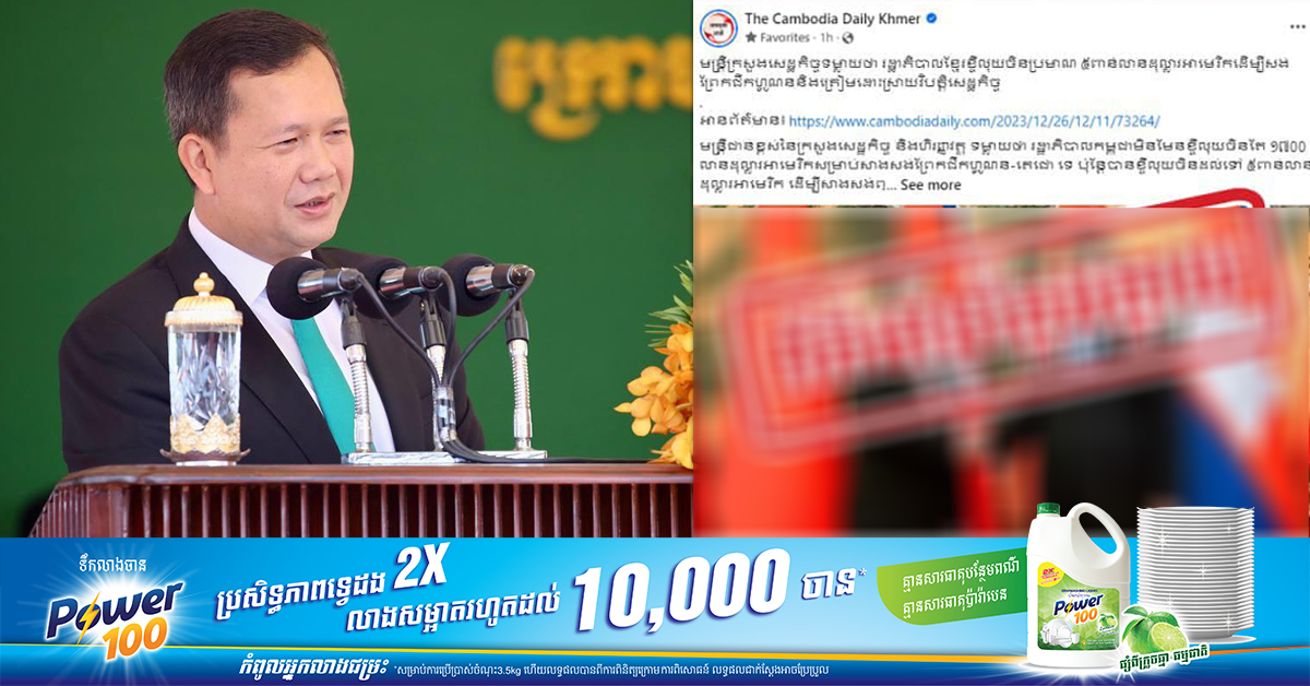 (ភ្នំពេញ)៖ សម្តេចមហាបវរធិបតី ហ៊ុន ម៉ាណែត នាយករដ្ឋមន្រ្តីនៃកម្ពុជា បានអះអាងថា ការផ្សព្វផ្សាយរបស់កាសែត The Cambodia Daily ដោយដាក់ប្រភពពីមន្រ្តីក្រសួងសេដ្ឋកិច្ចថា «រដ្ឋាភិបាលកម្ពុជាខ្ចីថវិកាចិន ៥ពាន់លានដុល្លារ ដើម្បីសាងសង់គម្រោងព្រែកជីកហ្វូណនតេជោ»នោះ គឺជាព័ត៌មានប្រឌិតតាមការស្រមៃ ហើយសម្តេចមិនជឿថា មានមន្រ្តីជាន់ខ្ពស់ក្រសួងសេដ្ឋកិច្ច ល្ងង់ដល់ថ្នាក់មិនស្គាល់គម្រោង BOT (Build-Operate-Transfer)។ ការបញ្ជាក់របស់សម្តេចធិបតី ហ៊ុន ម៉ាណែត បានធ្វើឡើងបន្ទាប់ពីសារព័ត៌មានអនឡាញ The Cambodia Daily បានចុះផ្សាយអត្ថបទមួយ កាលពីថ្ងៃទី២៦ ខែធ្នូ ឆ្នាំ២០២៣ លើគេហទំព័ររបស់ខ្លួន និងគណនីទំព័រហ្វេសប៊ុក «The