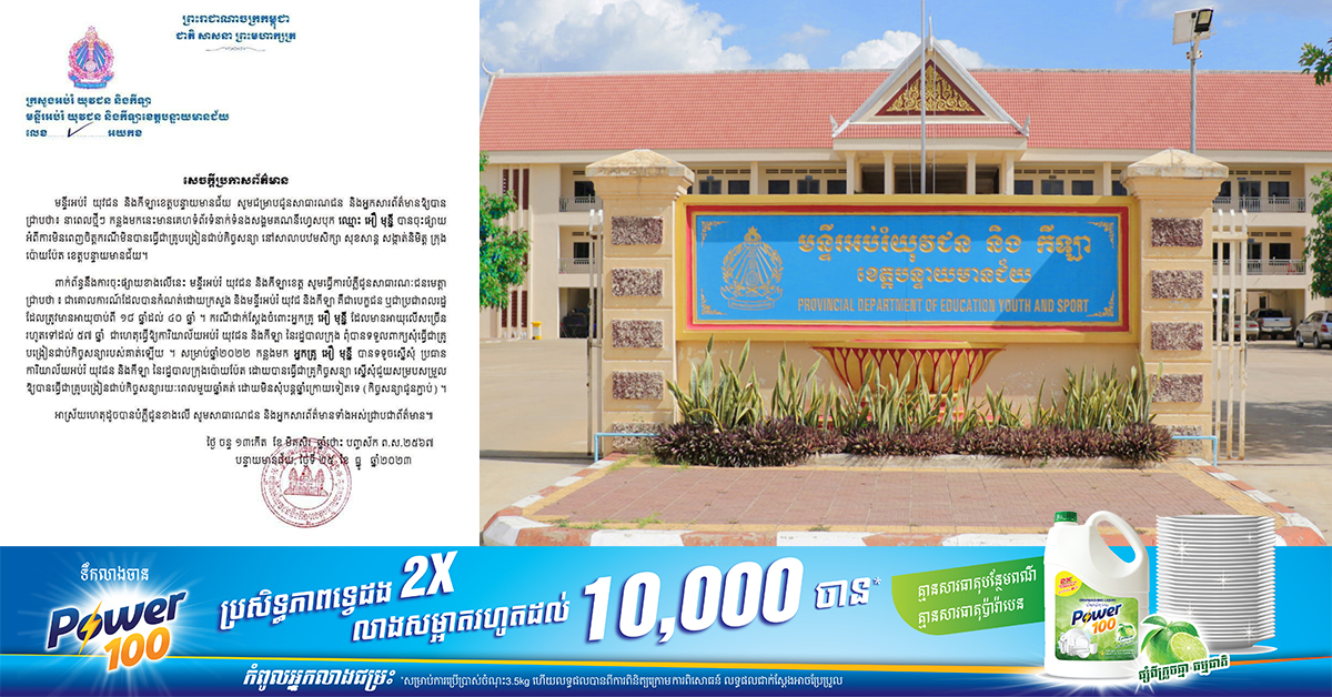 (បន្ទាយមានជ័យ)៖ មន្ទីរអប់រំ យុវជន និងកីឡាខេត្តបន្ទាយមានជ័យ នៅថ្ងៃទី២៥ ខែធ្នូ ឆ្នាំ២០២៣នេះ បានចេញប្រកាសព័ត៌មានថា នាពេលថ្មីៗកន្លងមកនេះមានគេហទំព័រទំនាក់ទំនងសង្គមគណនីហ្វេសបុក ឈ្មោះ អឿ មុន្នី បានចុះផ្សាយ អំពីការមិនពេញចិត្តករណីមិនបានធ្វើជាគ្រូបង្រៀនជាប់កិច្ចសន្យា នៅសាលាបឋមសិក្សាសុខសាន្ត សង្កាត់និមិត្ត ក្រុងប៉ោយប៉ែត ខេត្តបន្ទាយមានជ័យ។ ពាក់ព័ន្ធនឹងការចុះផ្សាយខាងលើនេះ មន្ទីរអប់រំ យុវជន និងកីឡាខេត្ត សូមធ្វើការបំភ្លឺជូនថា ជាគោលការណ៍ដែលបានកំណត់ដោយក្រសួង និងមន្ទីរអប់រំ យុវជន និងកីឡា គឺជាបេក្ខជន ឬជាប្រជាពលរដ្ឋ ដែលត្រូវមានអាយុចាប់ពី ១៨ ឆ្នាំដល់៤០ឆ្នាំ។ ករណីជាក់ស្ដែងចំពោះអ្នកគ្រូ អឿ