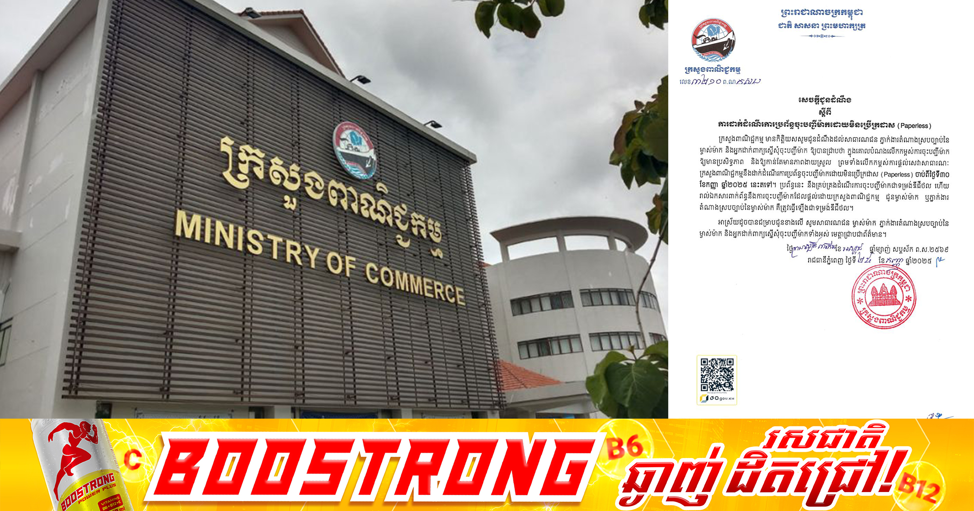 (ភ្នំពេញ)៖ ក្រសួងពាណិជ្ជកម្មនឹងដាក់ដំណើរការប្រព័ន្ធចុះបញ្ជីម៉ាកដោយមិនប្រើក្រដាស ដើម្បីលើកកម្ពស់ការចុះបញ្ជីម៉ាក ឱ្យមានប្រសិទ្ធភាព និងឱ្យកាន់តែមានភាពងាយស្រួល ព្រមទាំងលើកកម្ពស់ការផ្តល់សេវាសាធារណៈ។ នេះបើយោងតាមសេចក្តីជូនដំណឹងរបស់ក្រសួងពាណិជ្ជកម្ម។ ការដាក់ដំណើរការប្រព័ន្ធចុះបញ្ជីម៉ាកដោយមិនប្រើក្រដាស (Paperless) នឹងផ្តើមចាប់ពីថ្ងៃទី៣០ ខែកញ្ញា ឆ្នាំ២០២៥ នេះតទៅ។ ប្រព័ន្ធនេះ នឹងគ្រប់គ្រងដំណើរការចុះបញ្ជីម៉ាកជាទម្រង់ឌីជីថល ហើយ រាល់ឯកសារពាក់ព័ន្ធនឹងការចុះបញ្ជីម៉ាកដែលផ្តល់ដោយក្រសួងពាណិជ្ជកម្ម ជូនម្ចាស់ម៉ាក ឬភ្នាក់ងារ តំណាងស្របច្បាប់នៃម្ចាស់ម៉ាក គឺត្រូវធ្វើឡើងជាទម្រង់ឌីជីថល៕ ផ្ដល់សិទ្ធិដោយ៖ Freshnews