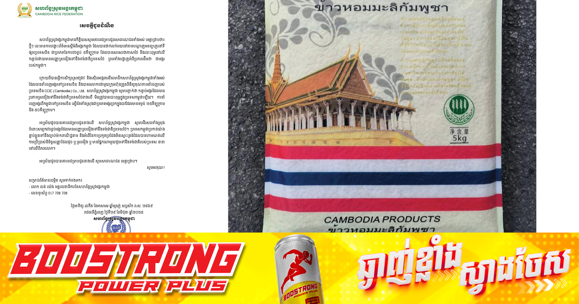 (ភ្នំពេញ)៖ សហព័ន្ធស្រូវអង្ករកម្ពុជា នៅថ្ងៃទី២៩ ខែមិថុនា ឆ្នាំ២០២៥នេះ ចេញសេចក្តីជូនដំណឹងមួយ ដោយបញ្ជាក់ឱ្យដឹងថា ថ្មីៗ នេះមានការបង្ហោះព័ត៌មាន ស្តីអំពីអង្ករកម្ពុជា ដែលបានដាក់លក់រាយនៅតាមបណ្តាញអនឡាញនៅទីផ្សារប្រទេសចិន ជាប្រភេទនៃការវេចខ្ចប់ ៥គីឡូក្រាម ដែលបានសរសេរជាភាសាថៃ និងបោះពុម្ពនៅលើកញ្ចប់ដោយមានសញ្ញាស្រដៀងទៅនឹងទង់ជាតិប្រទេសថៃ ព្រមទាំងបង្ហាញអំពីប្រភពដើមថា ជាអង្កររបស់កម្ពុជា។ សហព័ន្ធបញ្ជាក់ថា ក្រោយពីបានធ្វើការសិក្សាស្រាវជ្រាវ និងស៊ើបអង្កេតលើសមាជិកសហព័ន្ធស្រូវអង្ករកម្ពុជាទាំងអស់ ដែលបាននាំចេញអង្ករទៅប្រទេសចិន និងបានសហការជាមួយក្រុមហ៊ុនត្រួតពិនិត្យគុណភាពនាំចេញរបស់ប្រទេសចិន CCIC (Cambodia) Co., Ltd. សហព័ន្ធស្រូវអង្ករកម្ពុជារកឃើញថា កញ្ចប់អង្ករដែលមានរូបភាពស្រដៀងទៅនឹងទង់ជាតិប្រទេសថៃខាងលើ មិនត្រូវបានបោះពុម្ពក្នុងប្រទេសកម្ពុជាឡើយ។ ការនាំចេញអង្ករពីកម្ពុជាទៅប្រទេសចិន ស្ទើរតែទាំងស្រុងជាប្រភេទអង្ករច្រកក្នុងបាវដែលមានទម្ងន់ ២៥គីឡូក្រាម និង ៥០គីឡូក្រាម។ សហព័ន្ធស្រូវអង្ករកម្ពុជា