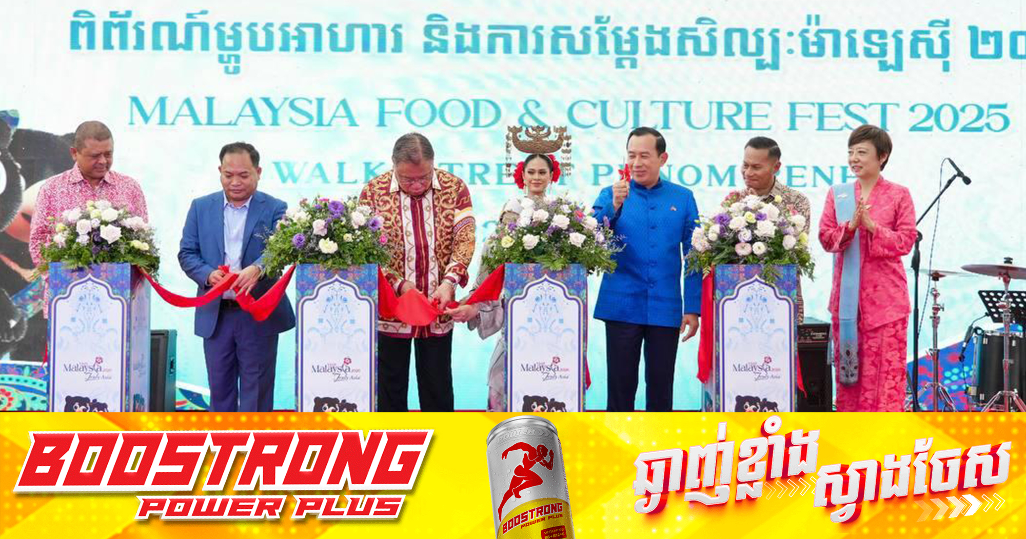 (ភ្នំពេញ)៖ តបតាមការអញ្ជើញពីស្ថានទូតម៉ាឡេស៊ីប្រចាំកម្ពុជា លោក ហួត ហាក់ រដ្ឋមន្រ្តីក្រសួងទេសចរណ៍កម្ពុជា បានអញ្ជើញចូលរួមជាគណៈអធិបតីជាមួយលោក Dato Sri Tiong King Sing រដ្ឋមន្រ្តីក្រសួងទេសចរណ៍ សិល្បៈ និងវប្បធម៌ម៉ាឡេស៊ី កាត់ខ្សែបូរសម្ពោធបើកកម្មវិធីពិព័រណ៍ម្ហូបអាហារ និងការសម្តែងសិល្បៈម៉ាឡេស៊ី ឆ្នាំ២០២៥ (Malaysia Food and Culture Fest 2025) នាថ្ងៃទី២១ ខែមិថុនា ឆ្នាំ២០២៥ នៅផ្លូវថ្មើរជើងចតុមុខ (walk street) ។ កម្មវិធីពិពរណ៍នេះ មានការយាងចូលរួមពីសំណាក់ព្រះអង្គម្ចាស់ នរោត្តម ចក្រាវុធ