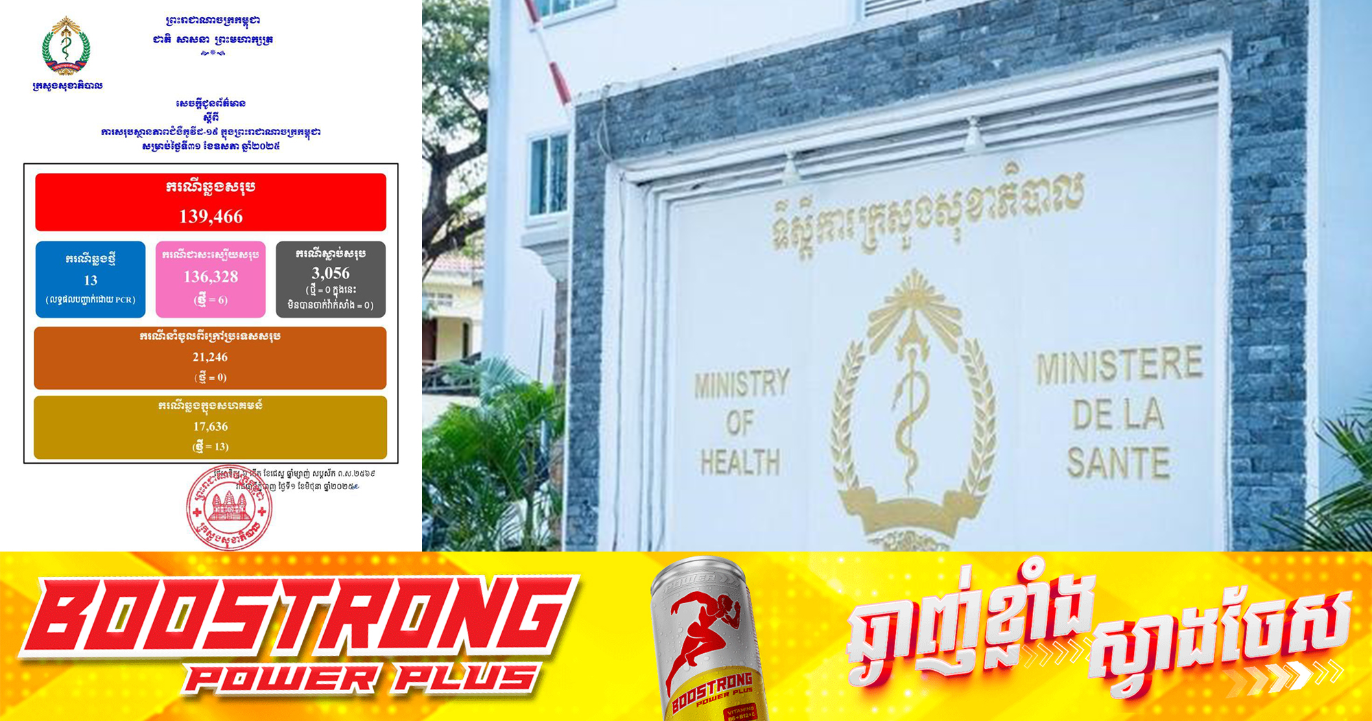(ភ្នំពេញ)៖ ក្រសួងសុខាភិបាល នៅថ្ងៃទី១ ខែមិថុនា ឆ្នាំ២០២៥នេះ បានចេញសេចក្តីប្រកាសព័ត៌មាន បញ្ជាក់ពីការរកឃើញអ្នកឆ្លងកូវីដ១៩ចំនួន ១៣នាក់ ខណៈជាអ្នកជាសះស្បើយ ៦នាក់។ សូមជម្រាបថា គិតត្រឹមការប្រកាសរបស់ក្រសួងសុខាភិបាល ថ្ងៃទី១ ខែមិថុនា ឆ្នាំ២០២៥ កម្ពុជារកឃើញអ្នកឆ្លងជំងឺកូវីដ១៩៖ សរុបចំនួន១៣៩,៤៦៦នាក់, អ្នកជាសះស្បើយសរុបចំនួន ១៣៦,៣២៨នាក់, ស្លាប់សរុបចំនួន ៣,០៥៦នាក់៕ ផ្ដល់សិទ្ធិដោយ៖ Freshnews