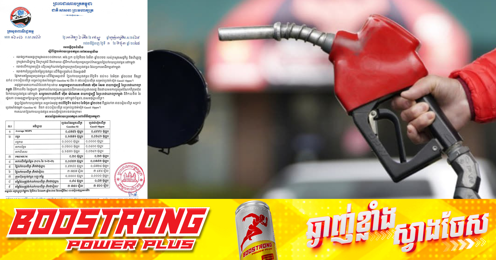 (រាជធានីភ្នំពេញ)៖ តាមរយៈការចេញផ្សាយរបស់ ក្រសួងពាណិជ្ជកម្ម នៅថ្ងៃទី១ ខែមិថុនា ឆ្នាំ ២០២៥ នេះ បានឱ្យដឹងពី តម្លៃលក់រាយប្រេងឥន្ធនៈនៅតាមស្ថានីយ ដែលត្រូវអនុវត្តចាប់ពីថ្ងៃទី១ ដល់ថ្ងៃទី១០ ខែមិថុនា ឆ្នាំ២០២៥ នេះ ៖ – ប្រេងសាំងធម្មតា = ៣ ៧៥០ រៀល/លីត្រ (តម្លៃថេរ) – ប្រេងម៉ាស៊ូត = ៣ ៥០០ រៀល/លីត្រ (តម្លៃថេរ)៕ ផ្ដល់សិទ្ធិដោយ៖ ខ្មែរណូត