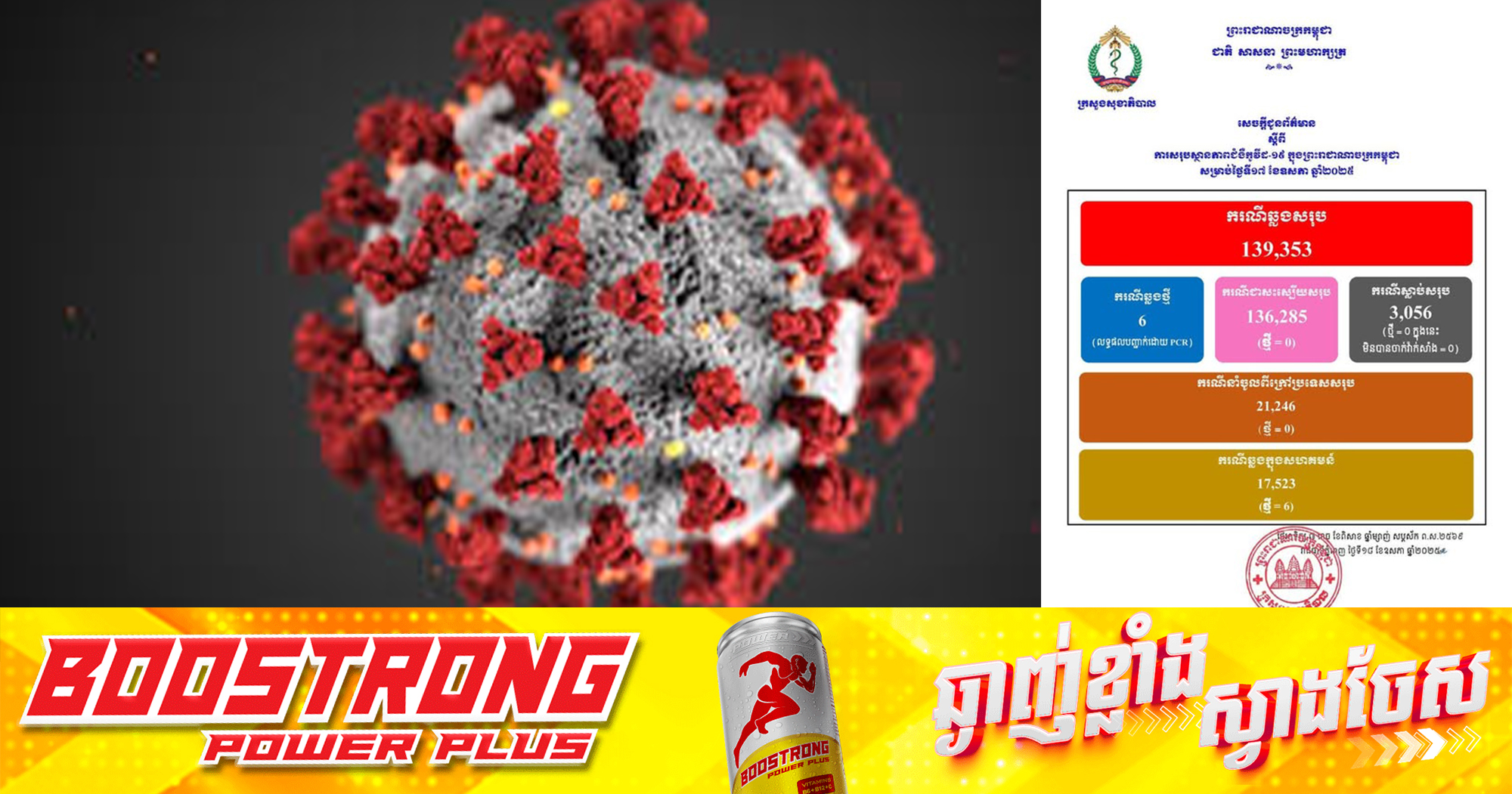 (ភ្នំពេញ)៖ ក្រសួងសុខាភិបាល នៅថ្ងៃទី១៨ ខែឧសភាឆ្នាំ២០២៥នេះ បានចេញសេចក្តីប្រកាសព័ត៌មាន បញ្ជាក់ពីការរកឃើញអ្នកឆ្លងកូវីដ១៩ចំនួន ៦នាក់ ខណៈអ្នកជាសះស្បើយគ្មាន។ សូមជម្រាបថា គិតត្រឹមការប្រកាសរបស់ក្រសួងសុខាភិបាល ថ្ងៃទី១៨ ខែឧសភា ឆ្នាំ២០២៥ កម្ពុជារកឃើញអ្នកឆ្លងជំងឺកូវីដ១៩៖ សរុបចំនួន១៣៩,៣៥៣នាក់, អ្នកជាសះស្បើយសរុបចំនួន ១៣៦,២៨៥នាក់, ស្លាប់សរុបចំនួន ៣,០៥៦នាក់៕ ផ្ដល់សិទ្ធិដោយ៖ Freshnews