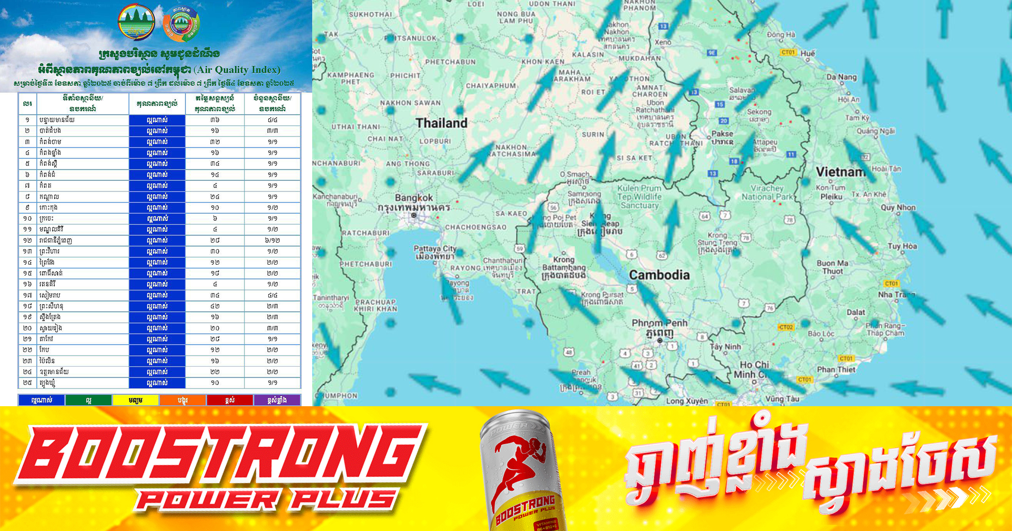 (ភ្នំពេញ)៖ ក្រសួងបរិស្ថាន ជូនដំណឹងអំពីស្ថានភាពគុណភាពខ្យល់នៅក្នុងព្រះរាជាណាចក្រកម្ពុជា សម្រាប់ថ្ងៃទី៣ ខែឧសភា ឆ្នាំ២០២៥ ចាប់ពីម៉ោង៧ព្រឹក ដល់ម៉ោង ៧ព្រឹកថ្ងៃទី៤ ខែឧសភា ឆ្នាំ២០២៥ ដែលមានកំហាប់ភាគល្អិតនិចលគិតជាមធ្យមស្មើនឹង១១.៥៧ µg/m3 ធៀបនឹងស្តង់ដារ ៥០ ug/m3 និងគិតជាសន្ទស្សន៍គុណភាពខ្យល់ (Air Quality Index) គឺ «ល្អណាស់»។ ពណ៌ខៀវៈ គុណភាពខ្យល់ល្អណាស់មាន ខេត្តបន្ទាយមានជ័យ ខេត្តកំពង់ធំ ខេត្តព្រះវិហារ ខេត្តសៀមរាប ខេត្តឧត្តរមានជ័យ រាជធានីភ្នំពេញ ខេត្តស្ទឹងត្រែង ខេត្តរតនគិរី ខេត្តព្រះសីហនុ ខេត្តកោះកុង ខេត្តពោធិ៍សាត់ ខេត្តកំពង់ចាម